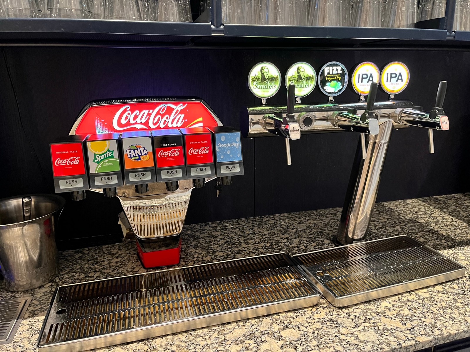 Deutlich besser war die Auswahl an Getränken. Wasser, Softdrinks, Kaffee & Tee sowie Wein und Bier konnte man sich an verschiedenen Getränkestationen selbst einschenken. Hochprozentige Getränke ließen sich an der Bar bestellen. Es standen die folgenden Cocktails/Mocktails zur Auswahl: