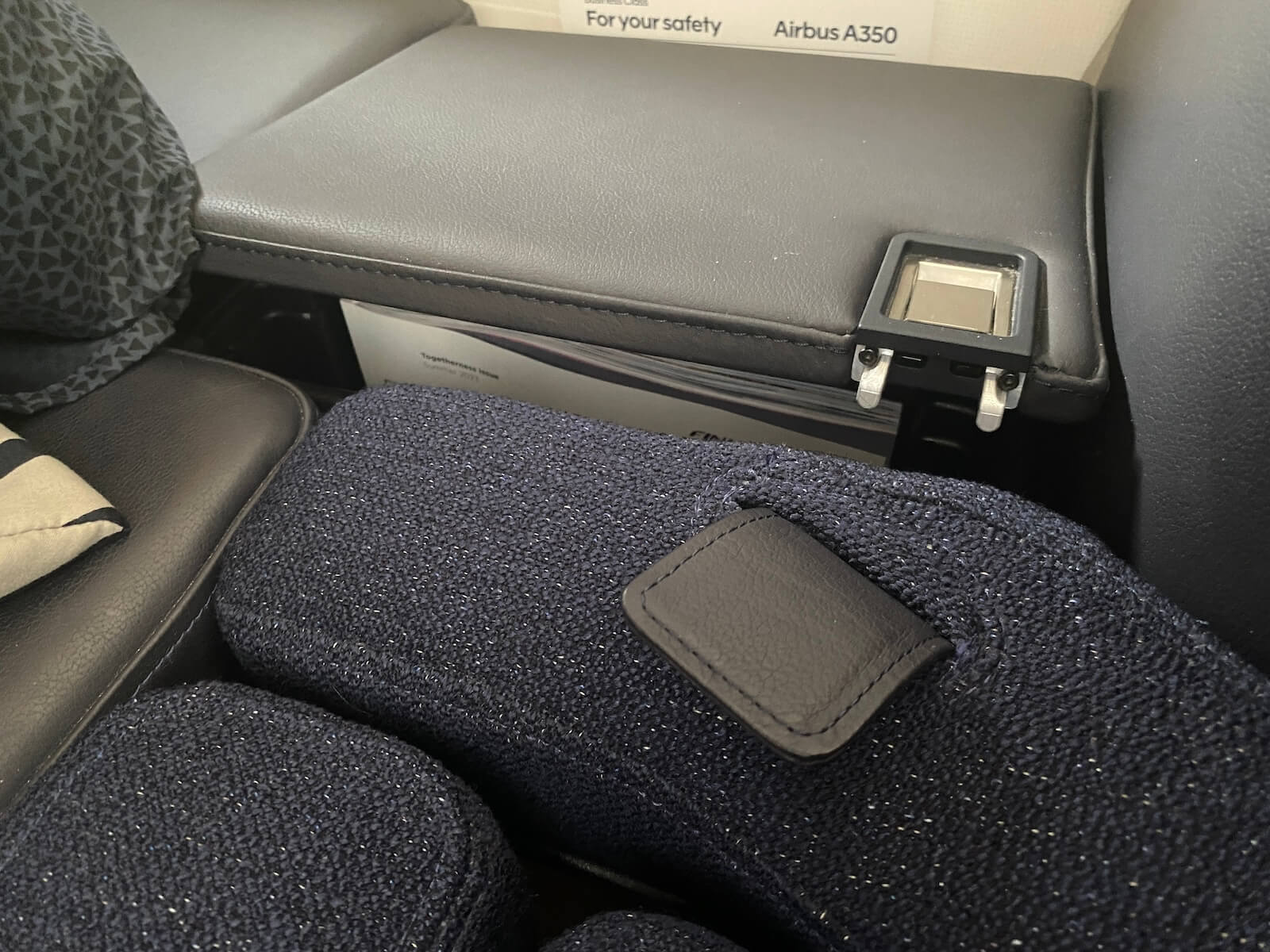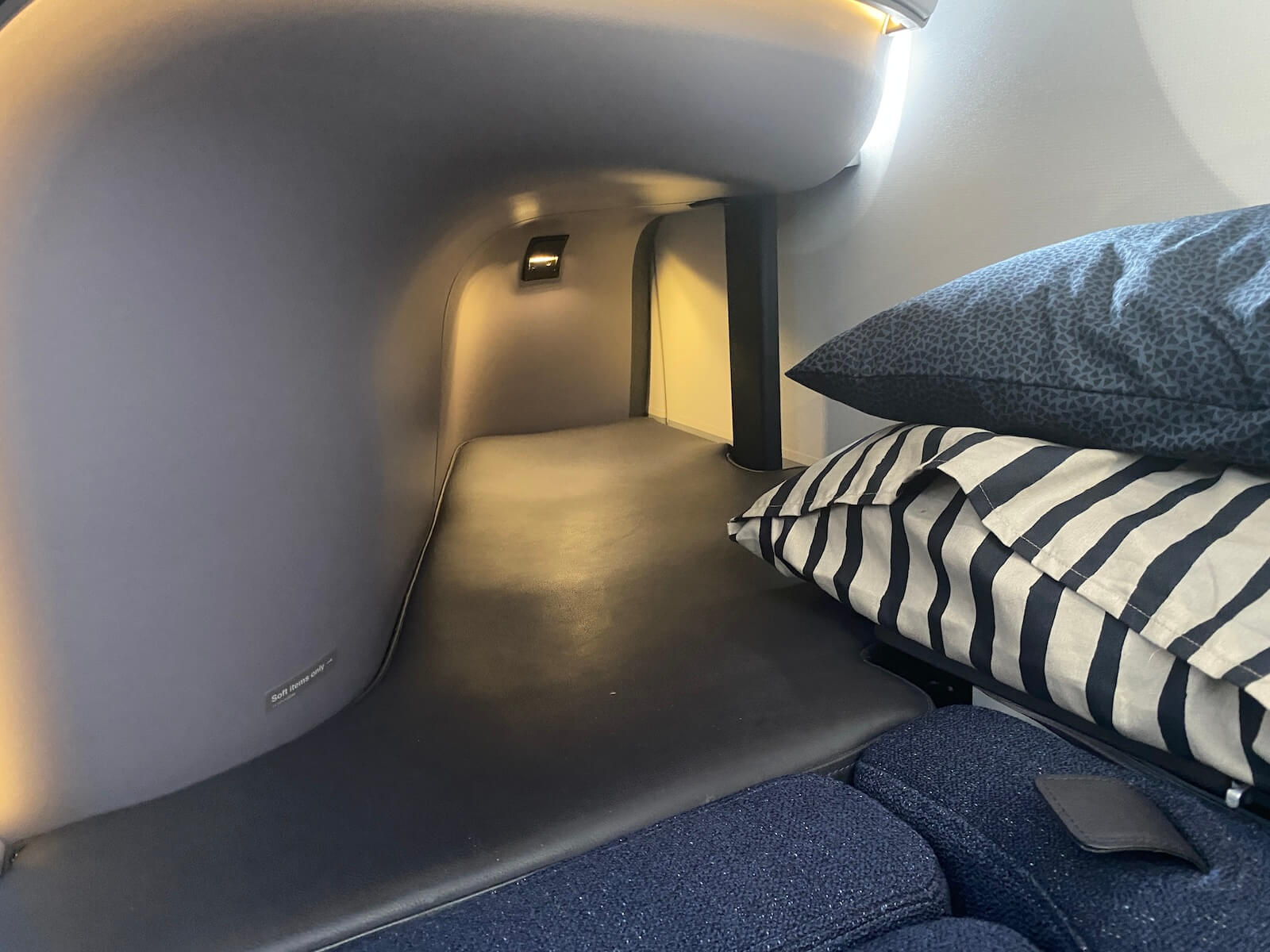 Der Gap zwischen der Fußablage unter der Sitzschale des vorderen Sitzes und dem eigenen Sitz kann durch das hochklappen bzw. hochfahren von zwei kleinen Ablageflächen geschlossen werden. Danach habt ihr ein Bett ohne eine Recliner Funktion des Sitzes. Leider war die Fußablage für meine Füße (Größe 46 – 48 je nach Hersteller des Schuhwerks) deutlich zu klein und ich lag sehr unbequem. Außerdem empfand ich den Verschluss des Dreipunktekurtes als nicht optimal positioniert und beim Liegen störend. Zwischen den Sitzen in der Mitte lässt sich eine Trennwand zum Sitznachbarn hochfahren, die einem zusätzliche Privatsphäre bietet.