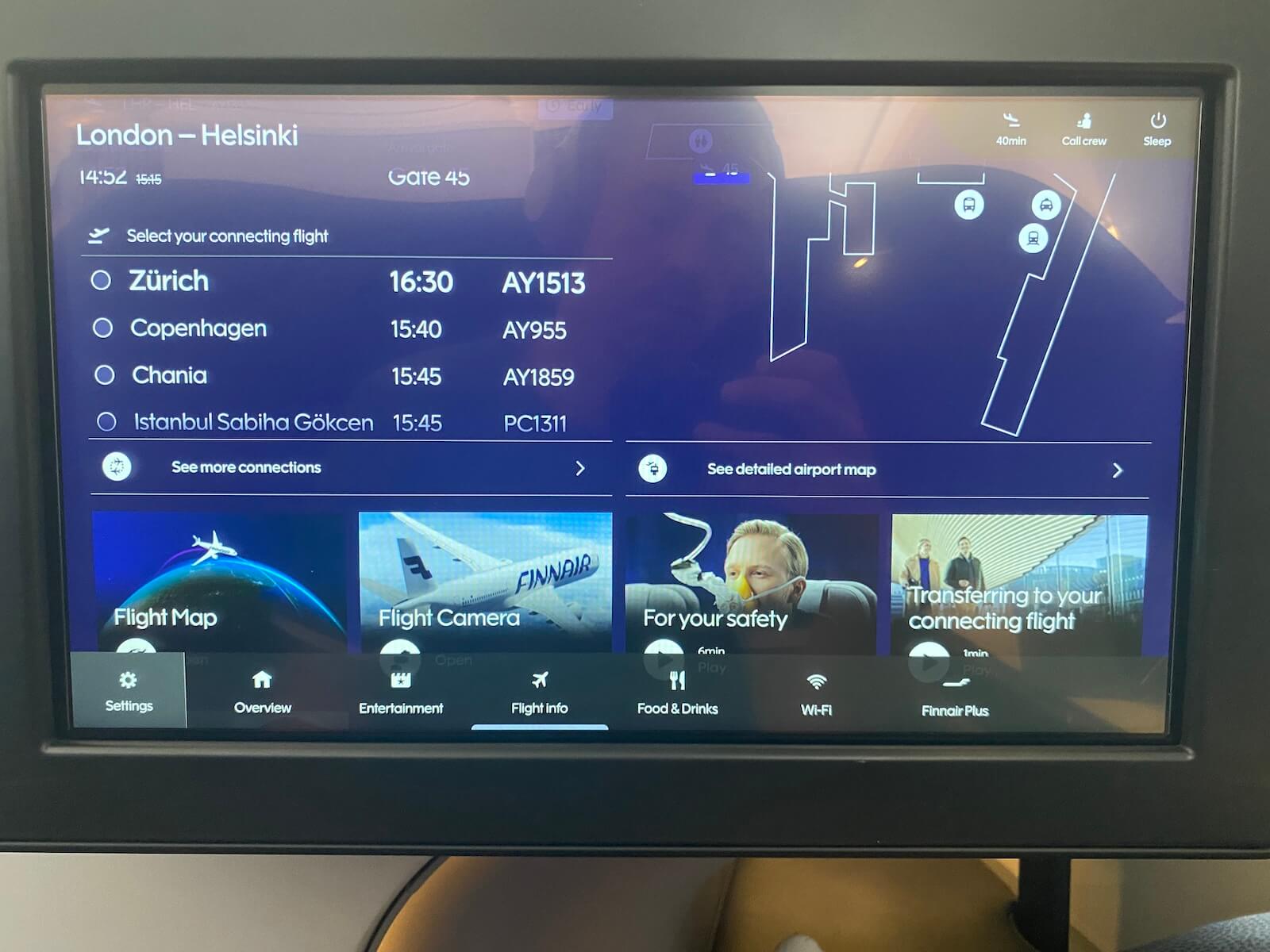 Das Routeninformationsprogramm hieß ARC und war von Panasonic Avionics, was ich noch nicht so häufig gesehen habe. Es hatte aber einige Funktionen zur Auswahl. Ich konnte zum Beispiel die großen Städte auf der Karte auswählen und mir ein paar Information dazu einholen. Grafisch gefiel mir das ARC sehr gut. Zusätzlich gab es noch Außenbordkameras am A350 und Informationen zu den Anschlussflügen in Helsinki.