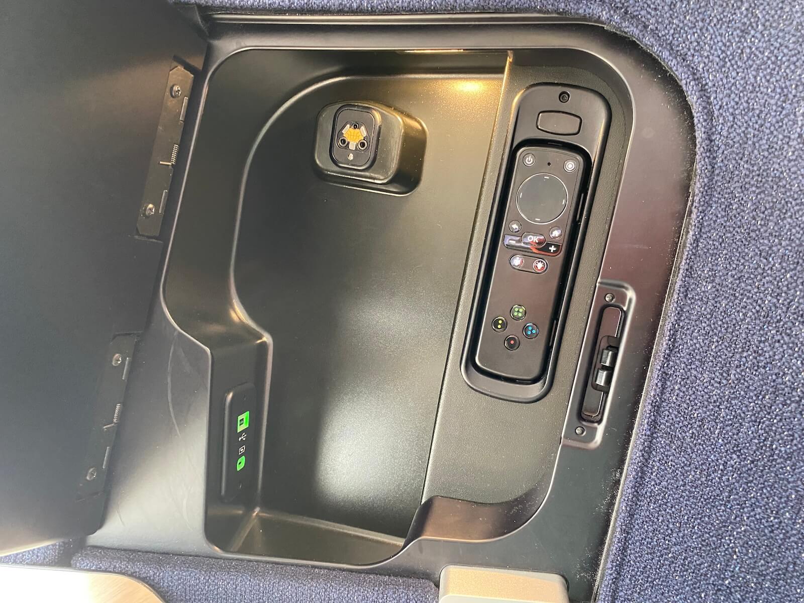 Die anderen Funktionen des Sitzes sind relativ simpel gehalten. Es gibt eine seitliche Ablagefläche, welche sich bei mir leider nicht mehr komplett verschließen ließ. Auf Kopfhöhe gibt es eine Leselampe und ein weiteres Fach, wo sich der Controller für den Monitor und die Kopfhörer (nur auf den Langstreckenflügen) befinden. Der Tisch und die Knöpfe zum Verschieben der Erweiterung des Sitzes befinden sich unter der Ablagefläche. Ich meine, dass der Tisch sich nicht weiter heranziehen ließ, so dass man beim Essen etwas zu weit weg saß, ein weiterer Kritikpunkt an dem Sitz! Ich schaute zu meinen Sitznachbarn, um zu sehen, ob ich irgendetwas übersehen hatte und sich der Tisch doch irgendwie verstellen ließ. Aber nein, auch diese saßen weit vorne auf ihren Sitzen. Einen Pluspunkt gibt es für die zahlreichen USB- und Strom-Anschlüsse sowie die integrierte Ladefunktion auf der Ablagefläche.