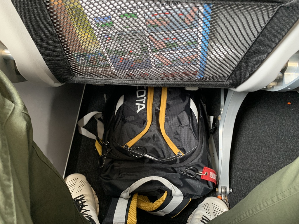 Unter dem Vordersitz lässt sich wie üblich ein Rucksack oder dergleichen verstauen, wobei dabei natürlich der Fußraum etwas eingeschränkt wird. Für einen knapp zweistündigen Flug jedoch absolut in Ordnung.