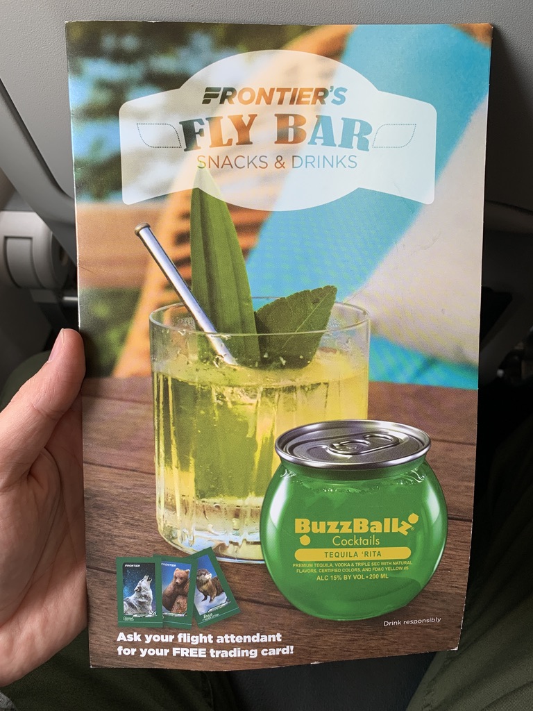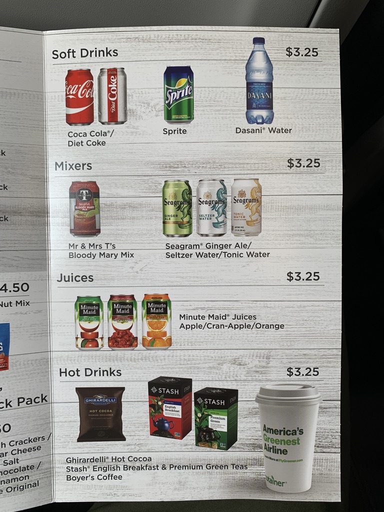 Gourmets kommen bei Frontier voll und ganz auf ihre Kosten – sofern man bereit ist dafür zu bezahlen und keine allzu hohen Ansprüche hat ;) Spass beiseite, analog zu vielen europäischen Legacy Airlines, die von sich behaupten 5 Sterne verdient zu haben, gibt es auch an Bord von Frontier eine Menükarte mit Getränken und Snacks welche erworben werden können. Die Preise empfinde ich dabei als eher hoch, und ein Wasser gibt es hier nicht umsonst im Gegensatz zu den Full Service Airlines.