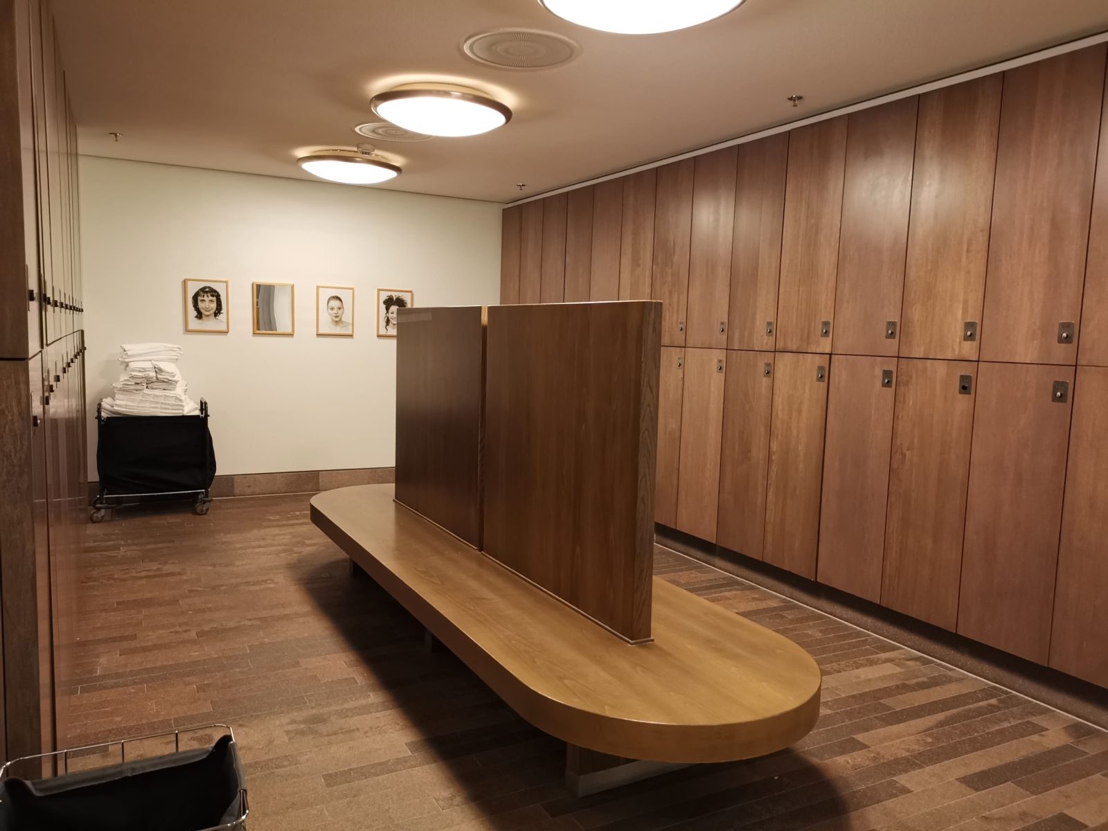 Über den längeren Flur ging es dann jeweils rechterhand ab zu den Männer- bzw. Damenumkleiden. Diese wiederum führten in den dazwischen gelegenen Saunabereich. Die Umkleiden waren großzügig geschnitten, modern eingerichtet und ebenfalls ausgestattet mit den nötigsten Dingen wie Haartrockner, Handtücher, Wasserspender usw.