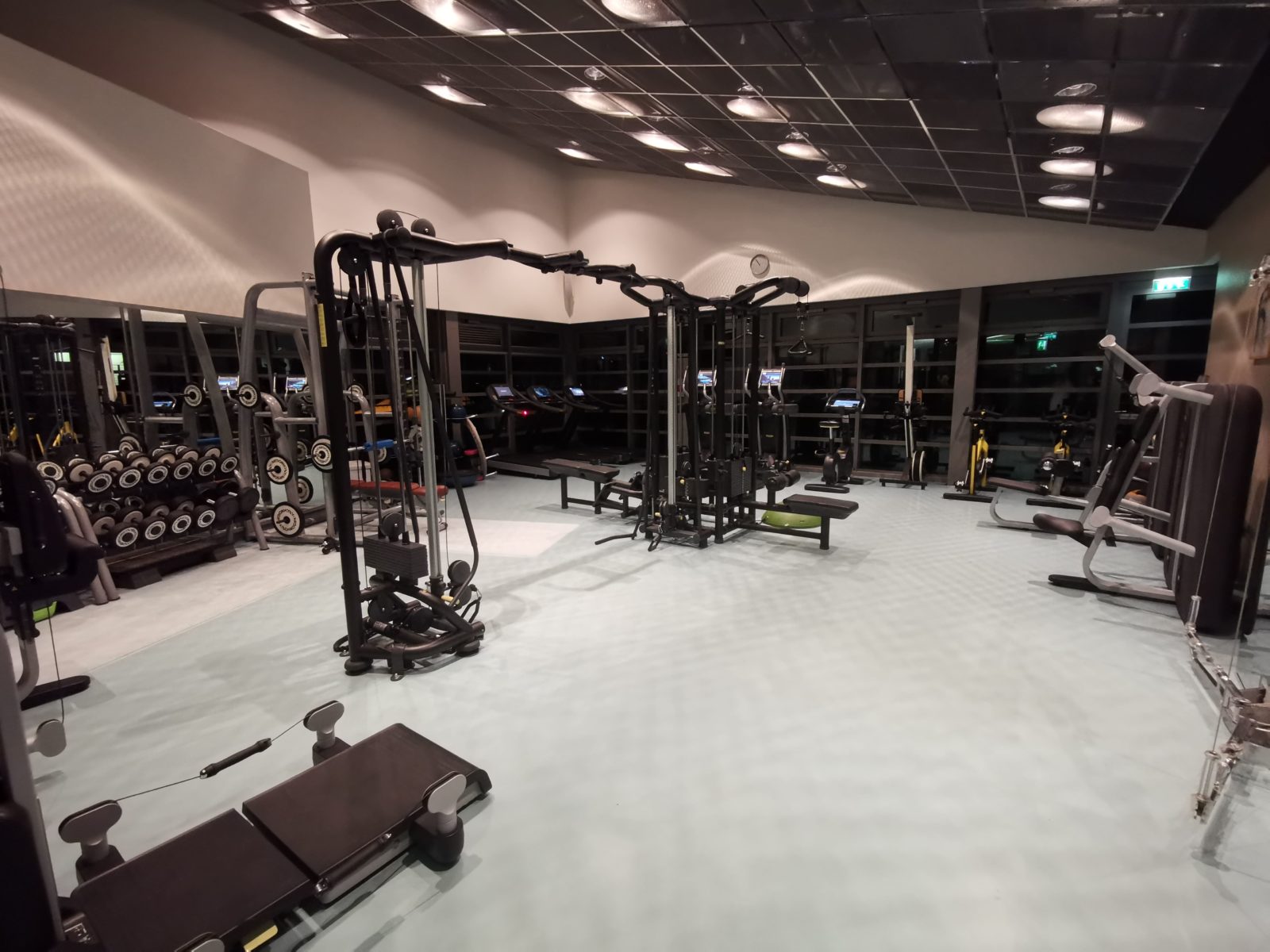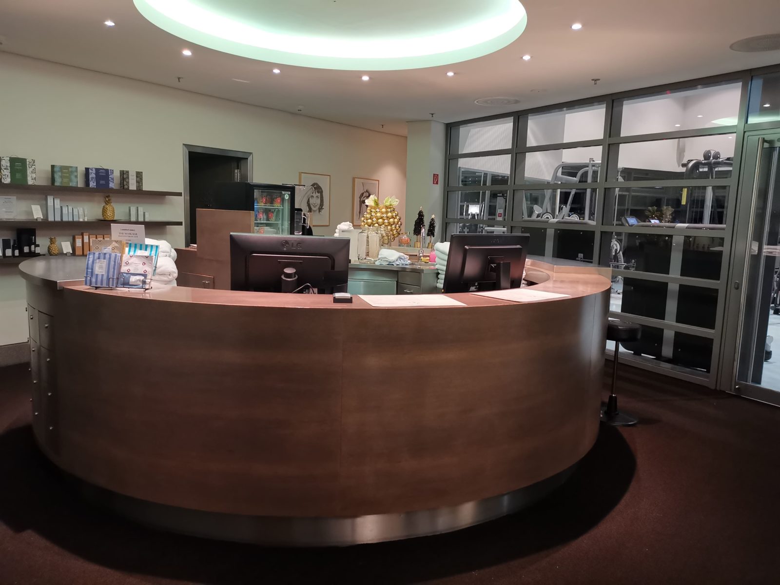 Der Fitness- und Spa Bereich “Club Olympus” konnte von allen Gästen kostenfrei genutzt und durch den bereits erwähnten separaten Fahrstuhl von jeder Etage aus bequem erreicht werden. Sobald man auf der 8. Etage angekommen war und einen mit Spiegeln ausgekleideten kleinen Raum hinter sich gelassen hatte, befand sich links der Flur zu den Umkleiden und dem Schwimmbereich und rechts jeweils separiert ein Empfangstresen und der Fitnessraum.