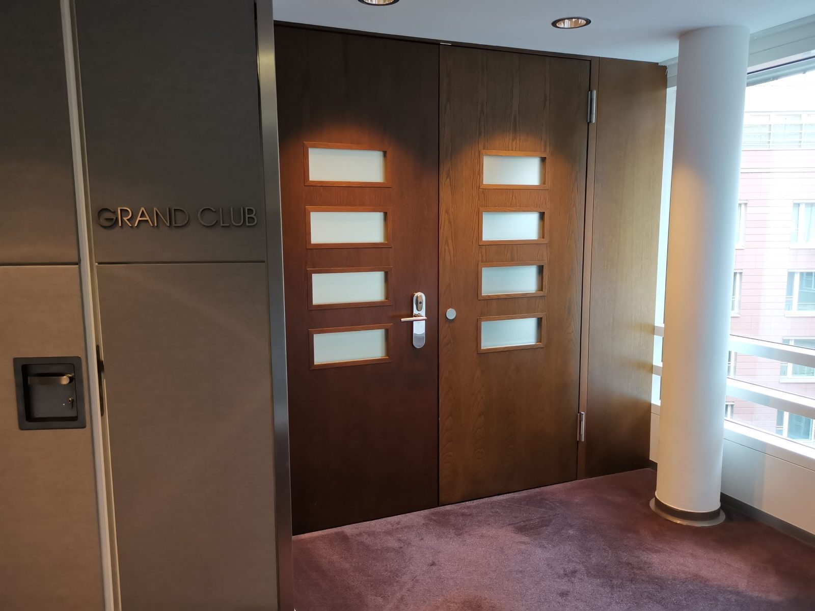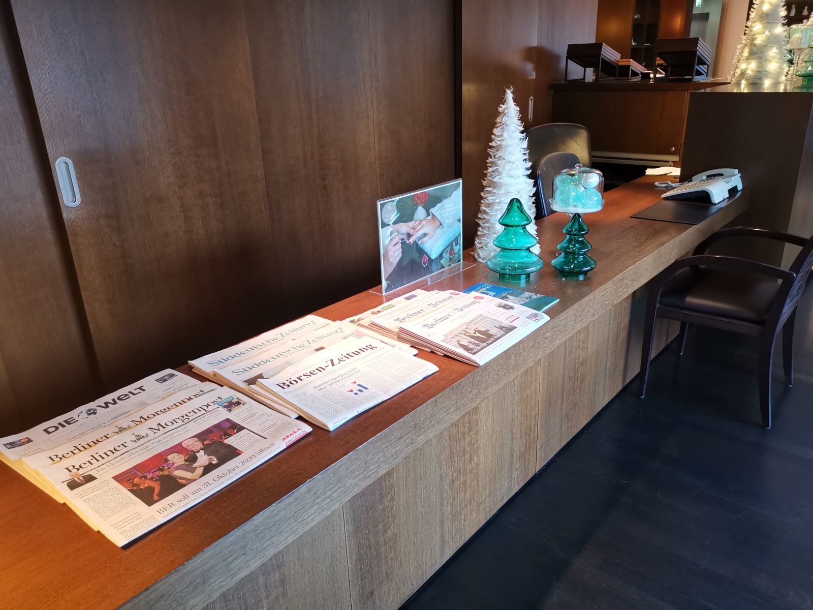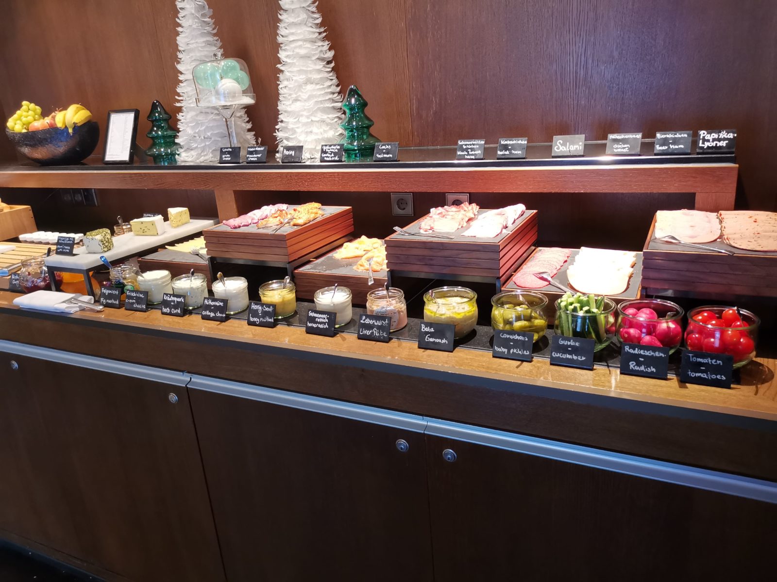 Im Eingangsbereich befand sich ein kleiner Raum mit einem iMac sowie eine Auslage mit einer großen Auswahl an nationalen und internationalen Tageszeitungen. Anschließend folgte eine Art Rezeption und das aufgebaute Frühstücksbuffet in der linken vorderen Ecke der Lounge. Im Nachhinein war es eine etwas abgespeckte Version des Buffets aus dem Vox Restaurant, jedoch war die Auswahl absolut ausreichend, um sich für den Tag zu stärken. Zudem war die Atmosphäre aufgrund der geringen Größe deutlich entspannter als im Vox Restaurant und auch das Personal war deutlich zuvorkommender. Weiterhin befanden sich in der Lounge zwei Fernseher auf denen jeweils N24 und CNN lief.