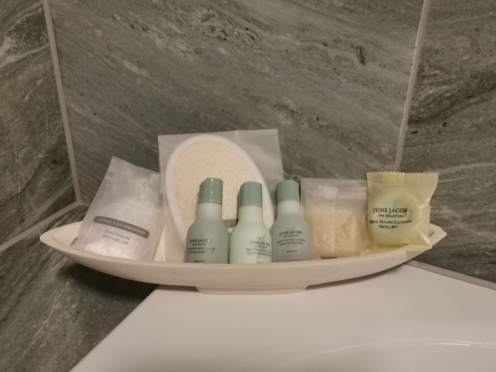 Das Marmorbad wirkte ebenso hochwertig, wie der Rest der Suite. Es verfügte zu unserer Freude über zwei separate Waschbecken, einen getrennten Bereich für die Toilette und einen weiteren Raum für die Badewanne und separate Dusche mit Regenduschkopf direkt davor. Zudem wurden mehrere hochwertige Pflegeprodukte bereitgestellt und ein Hinweis hinterlassen, bei weiterem Bedarf die Rezeption zu kontaktieren.