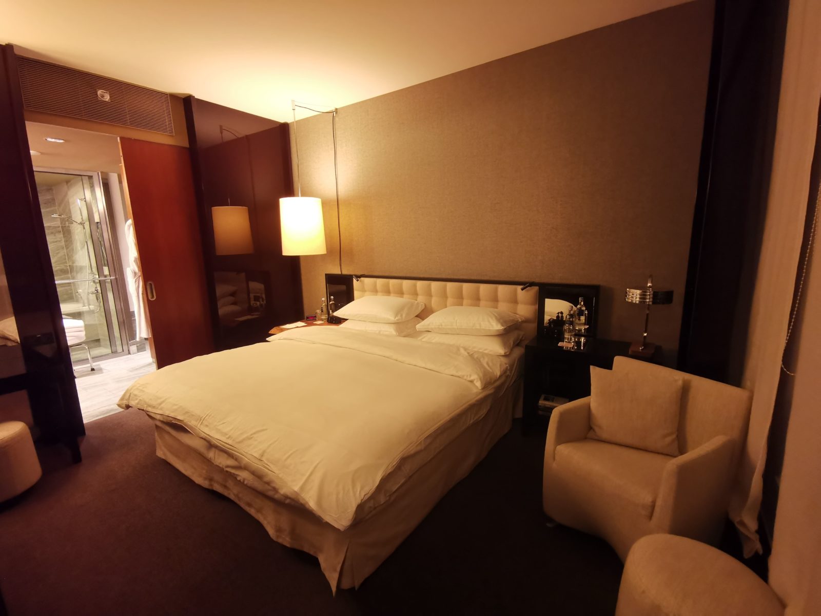 Wie bereits erwähnt, wurden wir in der ersten Nacht netterweise in einer Grand King Suite einquartiert. Der Ausblick war zwar alles andere als schön, da die Fenster auf Höhe des Daches der Eingangshalle und mit Blick auf die Fahrstühle gerichtet waren, die Suite an sich war dafür umso netter anzusehen. Diese ist in 2 separate Räume aufgeteilt und insgesamt 50 qm groß. Beim Betreten stand man im Wohnbereich mit einer Schrankwand, einem 55 Zoll Flatscreen, Tisch mit einem Stuhl und einer Sitzecke mit Sofa und Sessel. Alle Möbel in der Grand King Suite sind sehr dunkel gehalten, sodass das Zimmer allgemein dunkel wirkte. Dafür gab es zahlreiche Lichtquellen über beide Räume verteilt. Leider sind wir mit der Steuerung dieser aber etwas überfordert gewesen und haben es so beispielsweise nicht hinbekommen, im Badezimmer das Licht anzuschalten, ohne dabei auch alle übrigen Räume zu beleuchten. Ob das an unserer Unfähigkeit lag, oder die Technik tatsächlich etwas undurchsichtig ist, mag in den Raum gestellt bleiben.