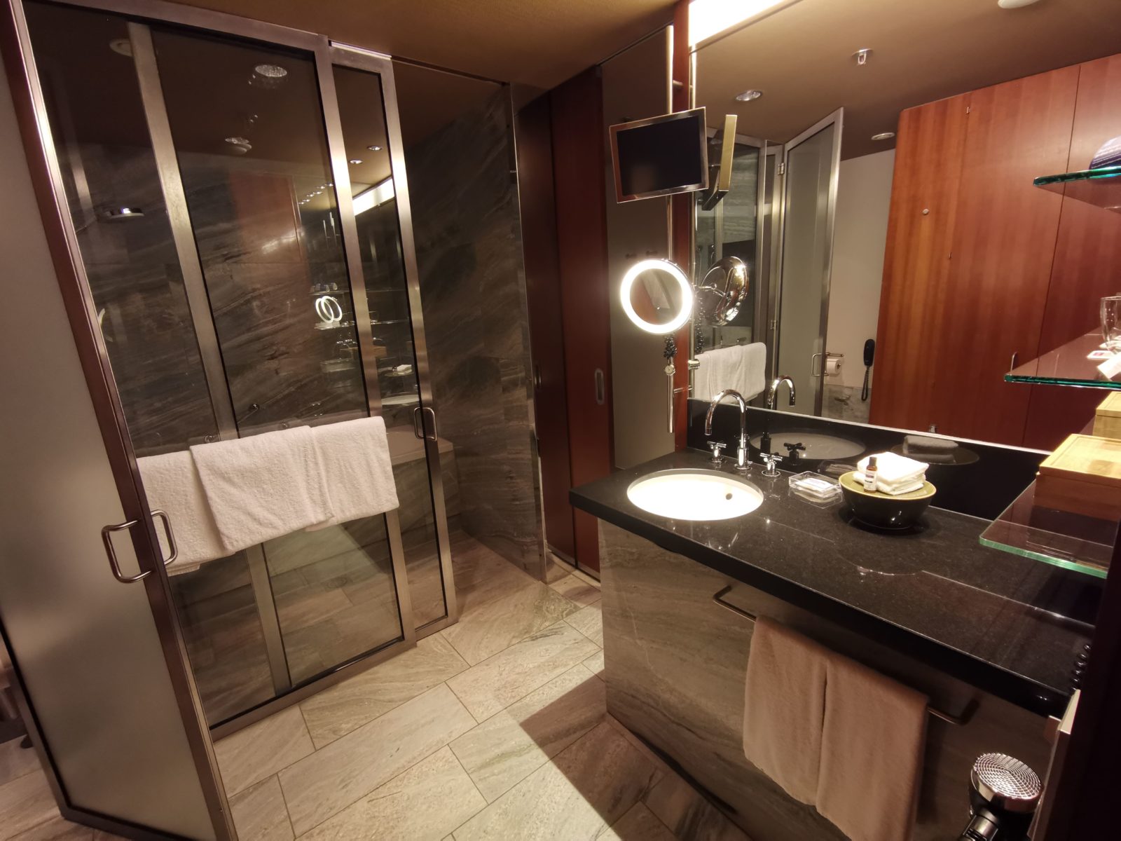 Auch das Bad war im Großen und Ganzen mit dem der Suite zu vergleichen. Hier konnte man den Raum jedoch von zwei Seiten aus betreten. Weiterhin war nur ein Waschbecken vorhanden und die Pflegeprodukte von einer anderen Marke als es in der Suite der Fall war. Ein kleiner Fernseher über dem Kosmetikspiegel und Bademäntel samt Schlappen waren aber auch hier vorhanden. Insgesamt waren wir mit dem Standardzimmer nicht weniger zufrieden, als mit der Grand King Suite.