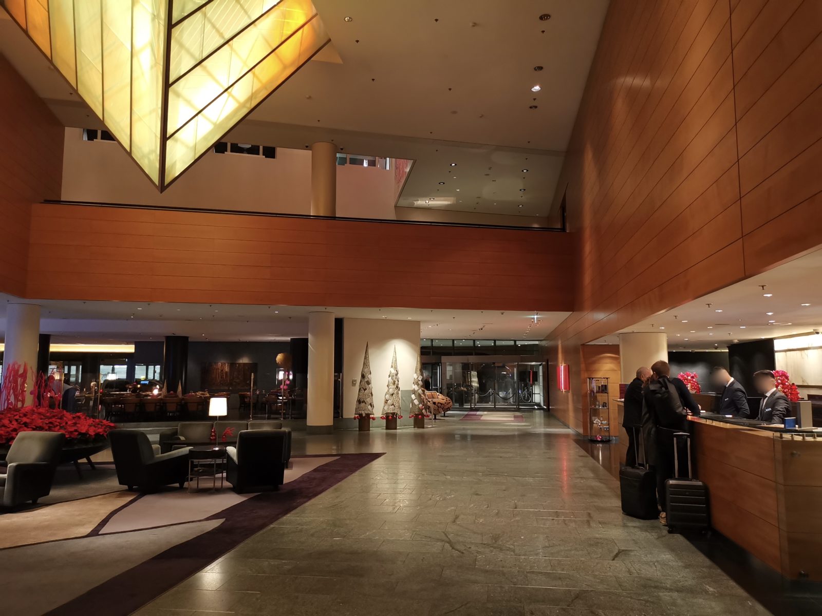 Wir waren gegen 19 Uhr am Hotel und haben dieses durch den zweiten Eingang (in diesem Artikel ganz oben zu sehen) betreten. Nachdem wir die Jamboree Bar und das Vox Restaurant links und rechts vom Eingang hinter uns gelassen hatten, betraten wir die durchaus imposante Eingangshalle.