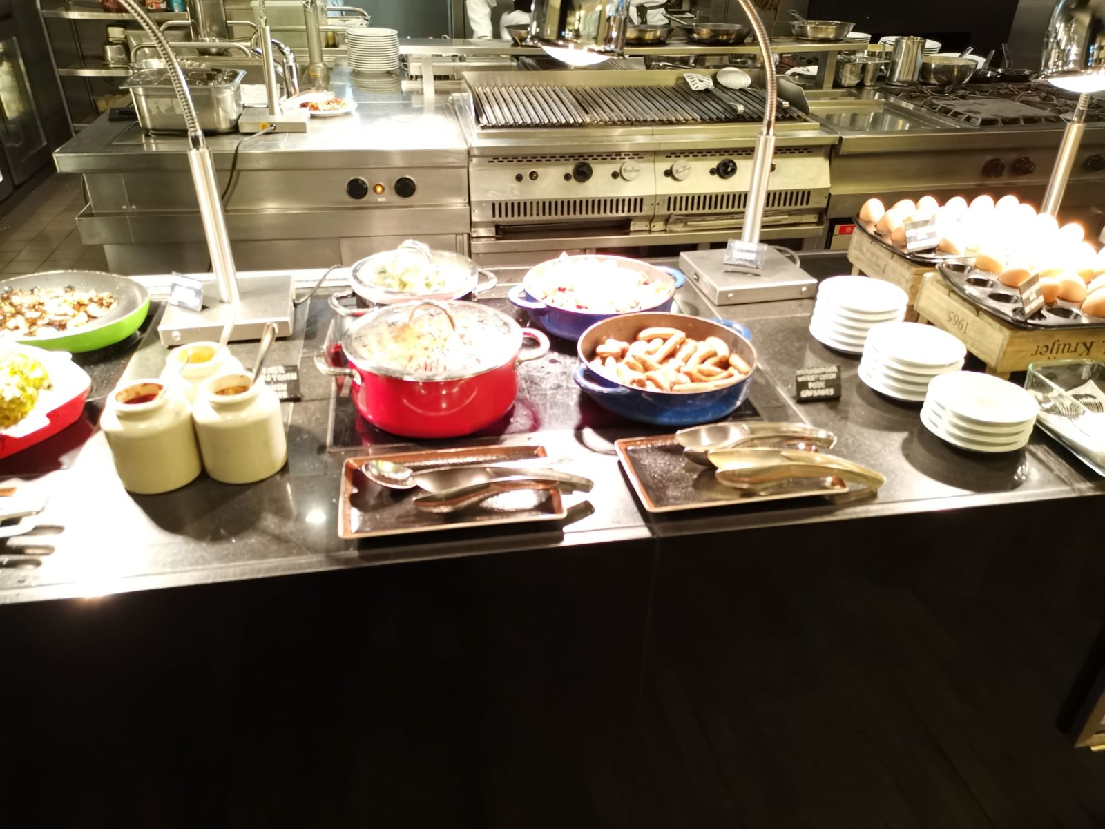 Bei Eintritt in das Restaurant wurden wir am Empfang nach unserer Zimmernummer gefragt und anschließend zu einem Bereich geführt, in dem wir uns einen Tisch aussuchen konnten. Nachdem die unserem Bereich zugeteilte Servicekraft unsere Getränkewünsche entgegengenommen hatte, machten wir uns auf zum umfangreichen Buffet, welches direkt vor der offenen Küche aufgebaut war. Wir erhielten keine gesonderte Karte, in der die frisch zubereiteten Warmspeisen aufgeführt waren. Auf Rückfrage bei einer Servicekraft bestellten wir anschließend (nach wie vor ohne Karte) einen Pancake mit Ahornsirup.