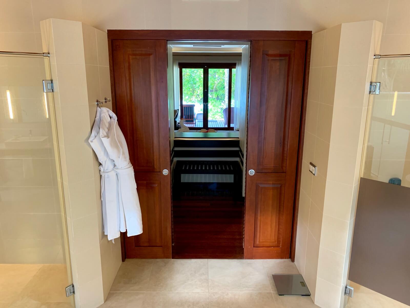 Wohn und Schlafbereich nahmen einen Großteil der Villa ein, doch auch das Bad bot noch jede Menge Platz. Über eine große Schiebetür betretbar durften wir uns über eine zwei Duschen (drinnen und draußen) und eine große Badewanne freuen. Durch eine Aussparung in der Wand hinter dem Bett war auch vom Bad der Blick aufs Meer möglich. Der Außenbereich des Bades war von einer hohen Mauer umgeben und ermöglichte das Duschen unter Palmen. Zur Verfügung standen natürlich die üblichen Hilton Amenities.