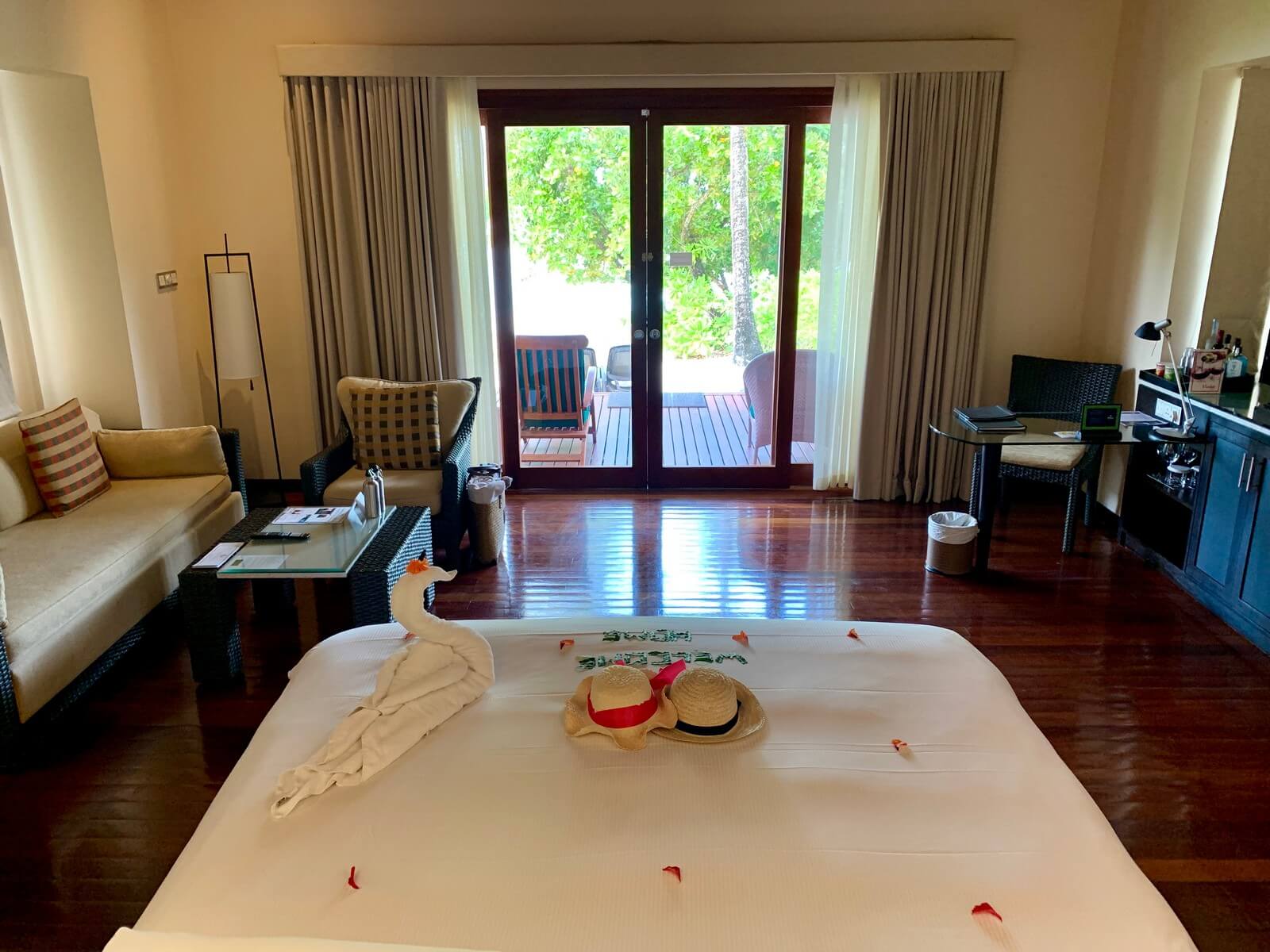 Die Check-In konnten wir bereits in der Hilton Jetty abwickeln. Bei einem kühlen Getränk und ein paar Snacks wurden uns die wichtigsten Infos zum Hotel erläutert und wir darüber informiert, dass wir ein Upgrade von der gebuchten King Garden Villa auf eine King Beach Front Villa erhalten sollten. Wieder einmal machte sich der Hilton Honors Gold Status meiner Amex Platinum also mehr als bezahlt. Der reguläre Aufpreis hätte ca. 150 Euro pro Nacht betragen, sodass dieses Upgrade einen Gegenwert von etwa 750 Euro hatte.