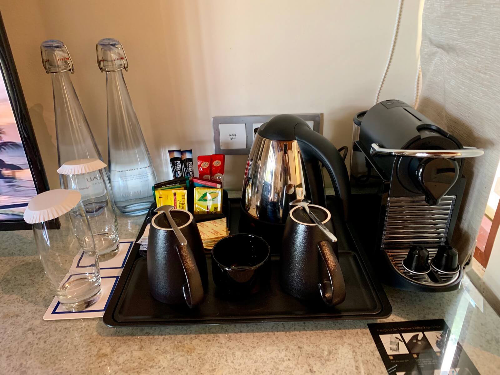 Bei unserer Ankunft warteten zwei wiederbefüllbare Metallflaschen auf uns. Diese konnten an verschiedenen Stellen im Resort an verschiedenen Stellen aufgefüllt werden. Das Resort hat sich dem Ziel verschrieben Plastik-Abfälle zu vermeiden. Zusätzlich gab es zwei große Wasserflaschen aus Glas, die täglich aufgefüllt bzw. ausgetauscht wurden. Eine kleine Kaffeemaschine stand ebenso zur Verfügung.