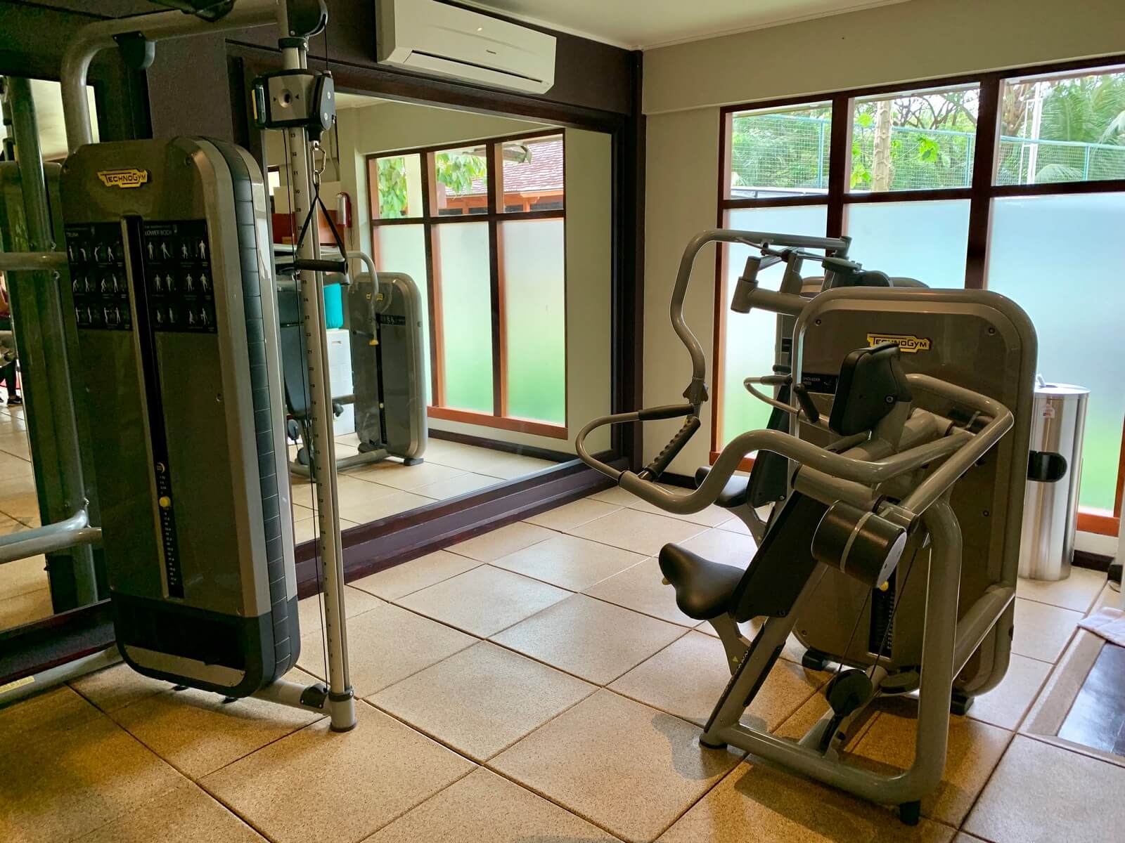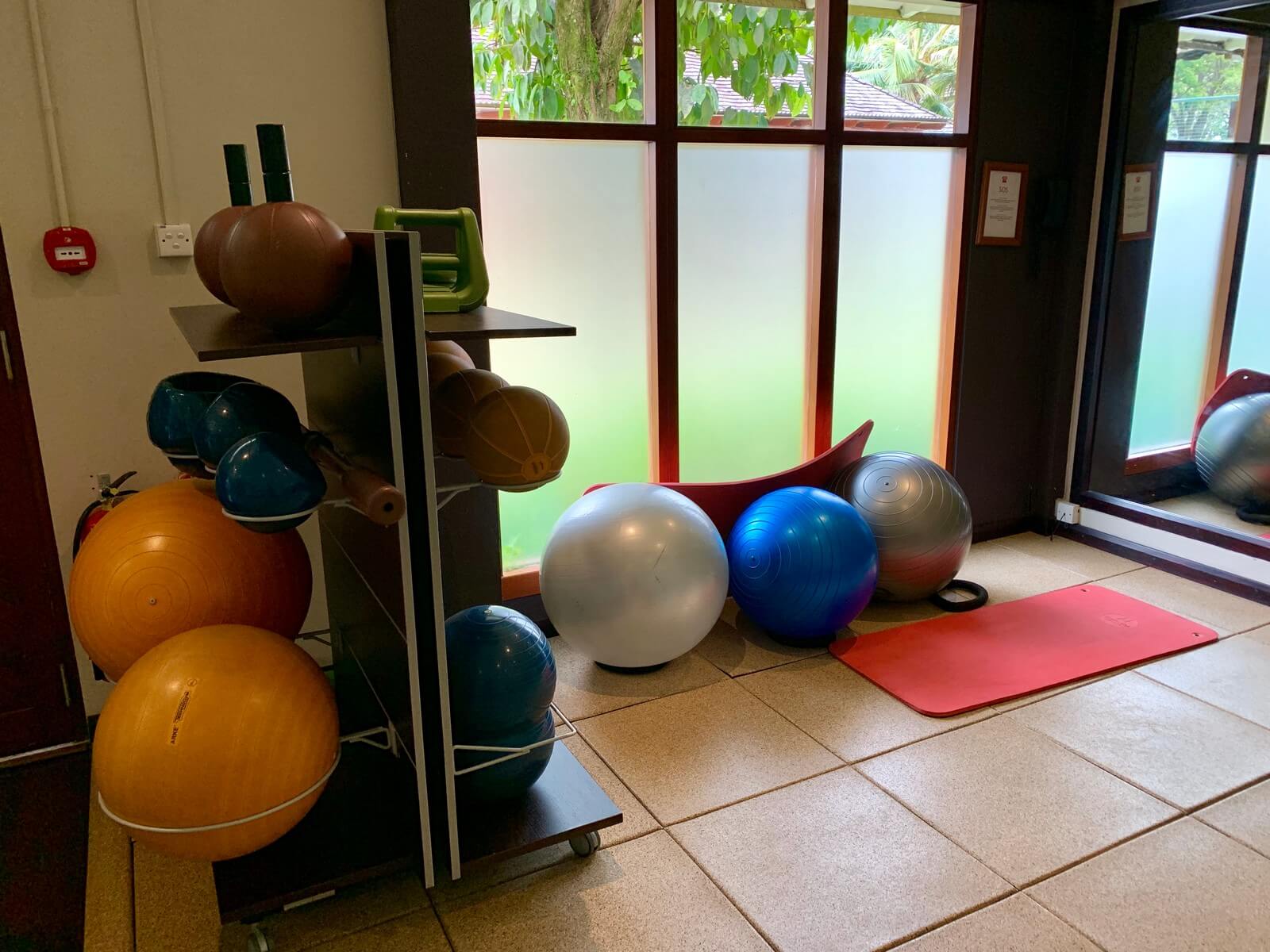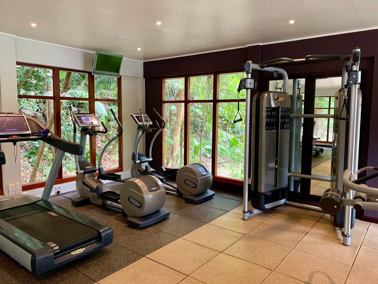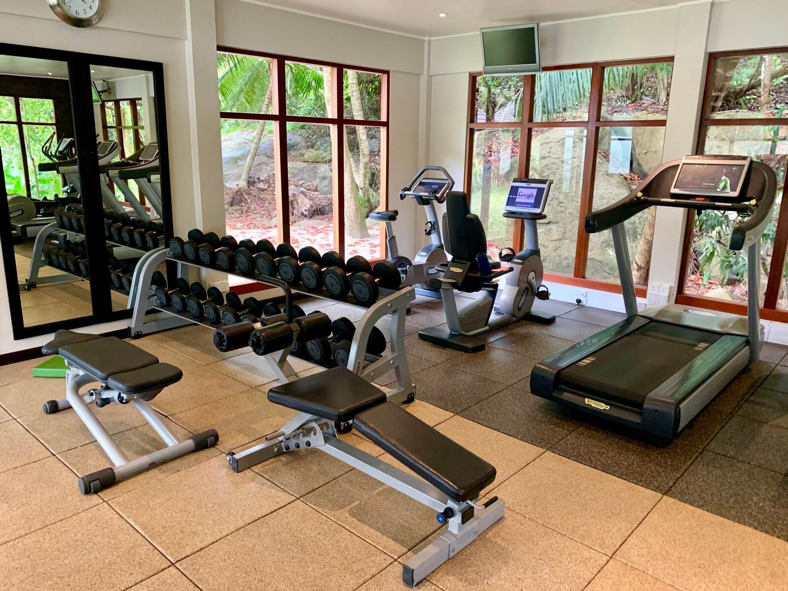 Das Hilton Seychelles Labriz Resort & Spa verfügt über kleines aber gut ausgestattetes Fitness-Studio, welches rund um die Uhr geöffnet ist. Im zentralen Bereich des Hotels gelegen bietet es einen Blick auf den Dschungel hinter dem Resort. Beim Joggen auf dem Laufband lässt es sich also ins Grüne schauen. Neben einigen Laufbändern und Fahrrädern standen eine Hand voll Technogym Geräte, Bälle und Hanteln bereit. Angesichts der Größe des Resorts war die Auswahl sicher angemessen.