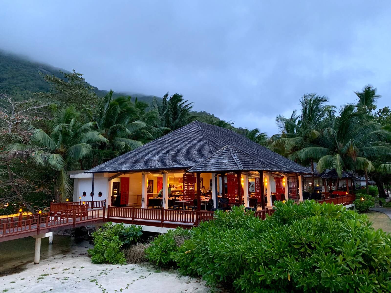 Doch wer braucht schon einen Pool, wenn man einen absoluten Traumstrand direkt vor der Tür hat? Der weiße Sandstrand erstreckt sich über die gesamte Länge des Resorts und bietet damit mehr als genug Platz. So war über den Strand auch das gesamte Resort zu erreichen. So konnten wir vor oder nach dem Essen jeweils einen Strandspaziergang einlegen. Am Horizont war die Hauptinsel Mahé und North Island mit dem ultra-luxuriösen North Island Resort zu sehen.