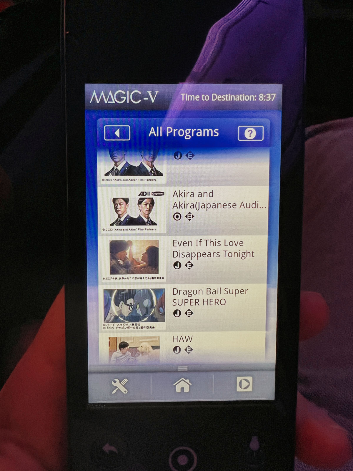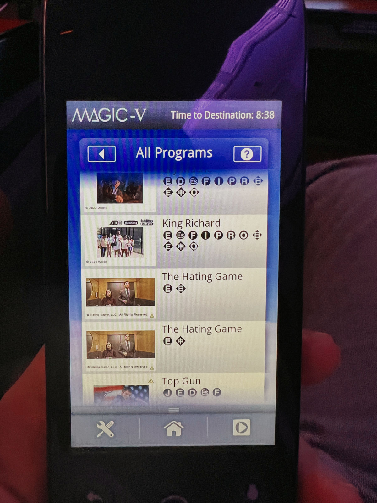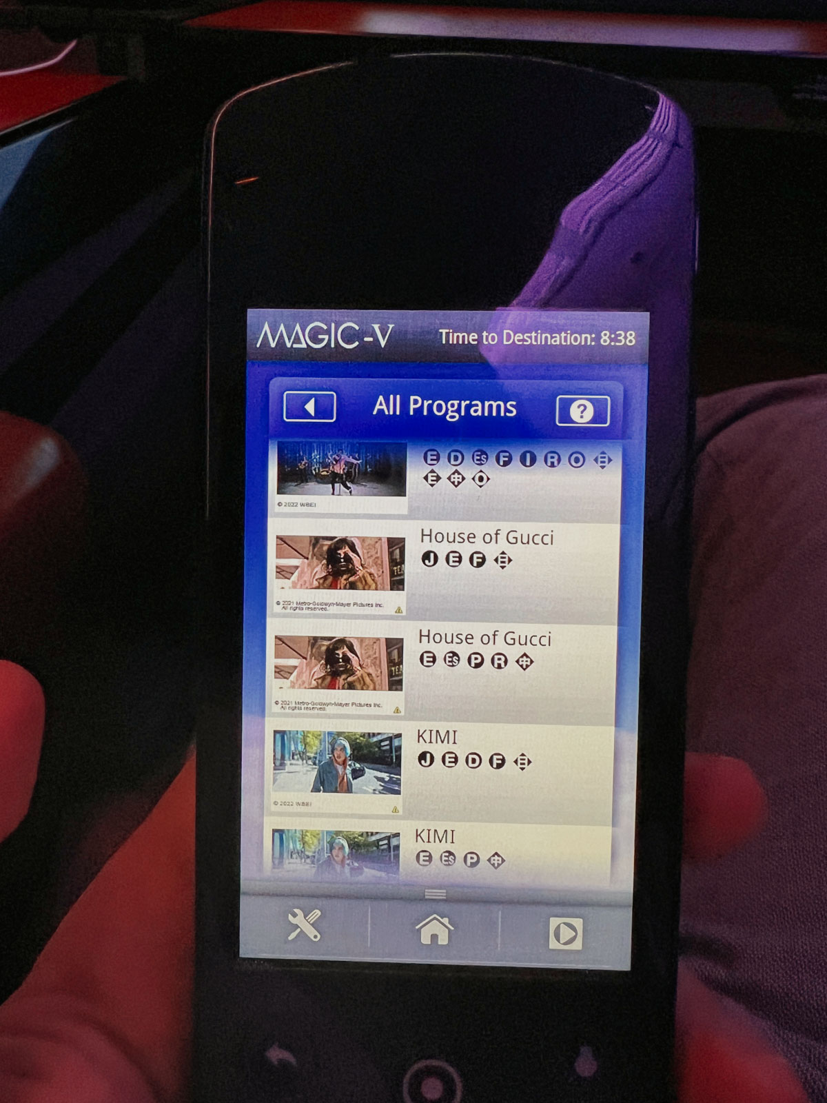 Etwas umständlich finde ich die Filmauswahl, denn diese ist ausschließlich über den kleinen IFE Controller möglich, auf dem großen Monitor wird die Auswahl nicht dargestellt. Über die Anzahl der Filme und Serien kann man sich definitiv nicht beschweren, es gibt zahlreiche neue und alte Blockbuster sowie Serien, einige davon allerdings leider mit nicht deaktivierbaren Untertiteln.