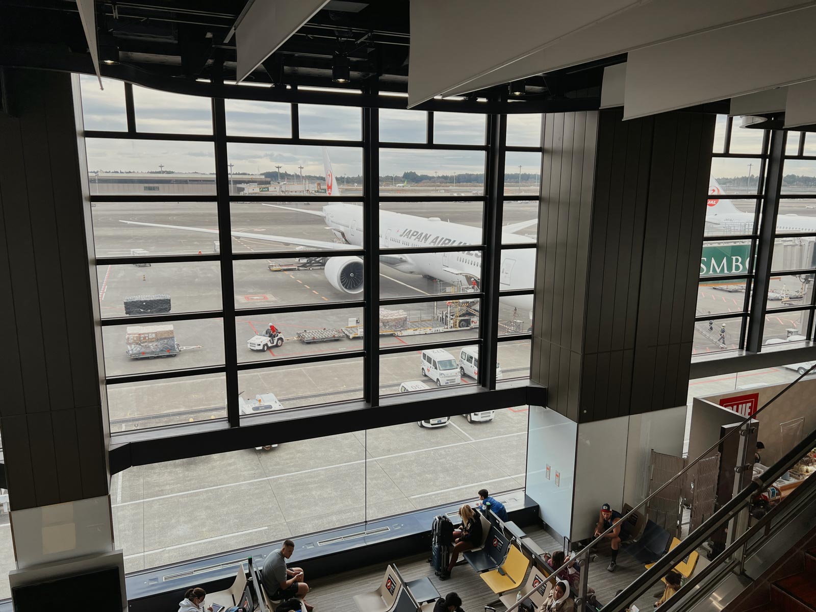 Nach meinem Besuch der Japan Airlines First Class Lounge Tokio Narita ging es ohne Transfer oder Begleitung zum Abfluggate. Bereits in der Lounge wurde eine Verspätung kommuniziert, sodass ich erst zur neuen Zeit eintraf, letztlich aber auch hier noch einmal warten musste. Das hat in diesem einen Fall also nicht so gut funktioniert mit der japanischen Pünktlichkeit, aber dafür hatte man relativ uneingeschränkte Sicht auf das Rollfeld und unseren Flieger.