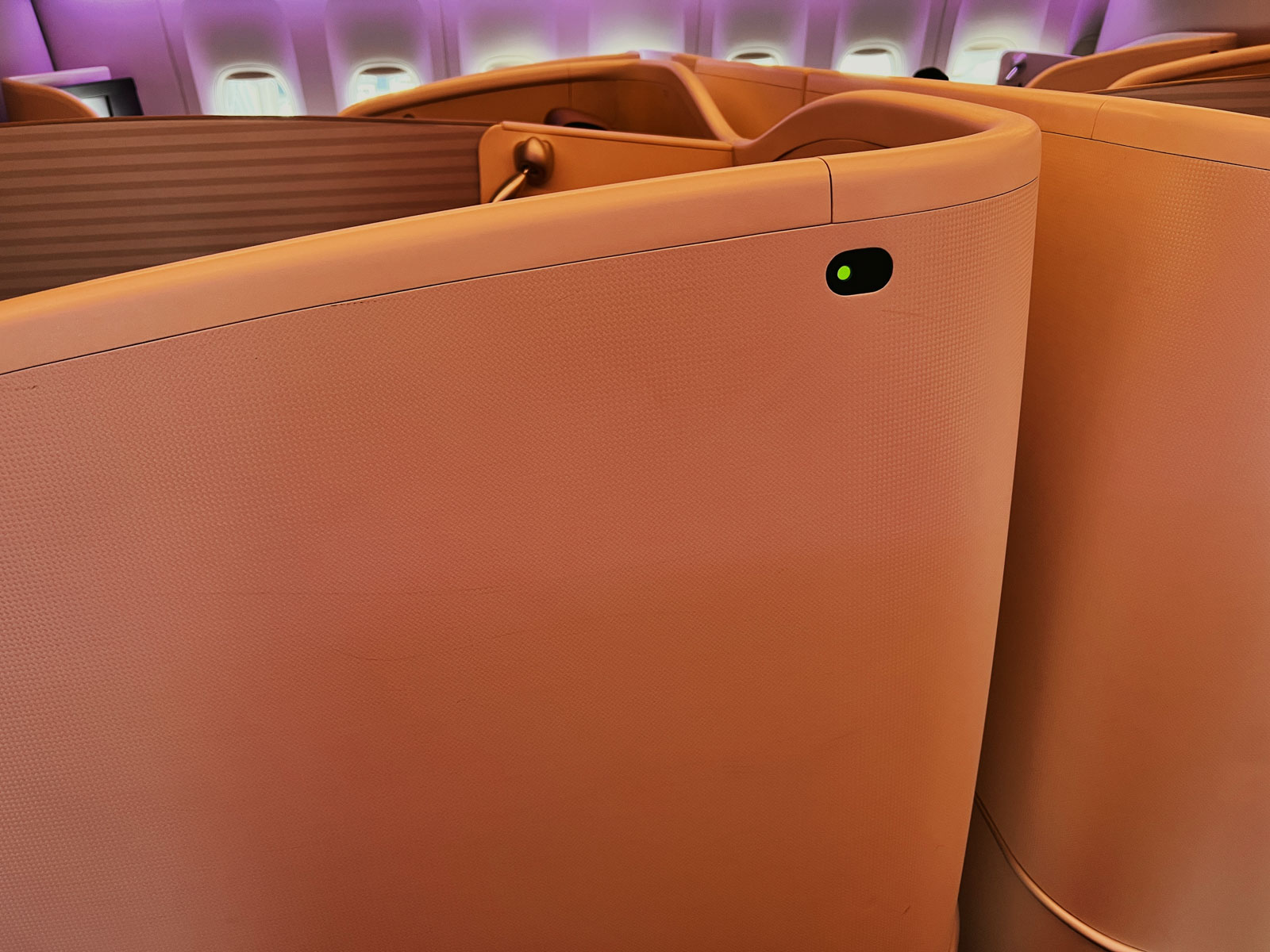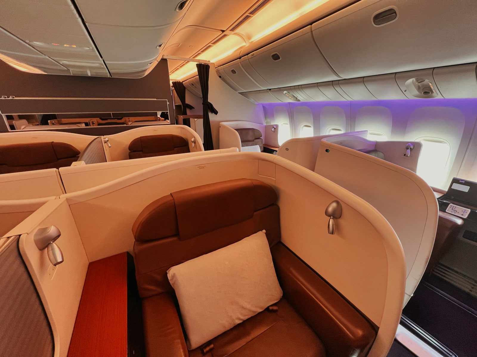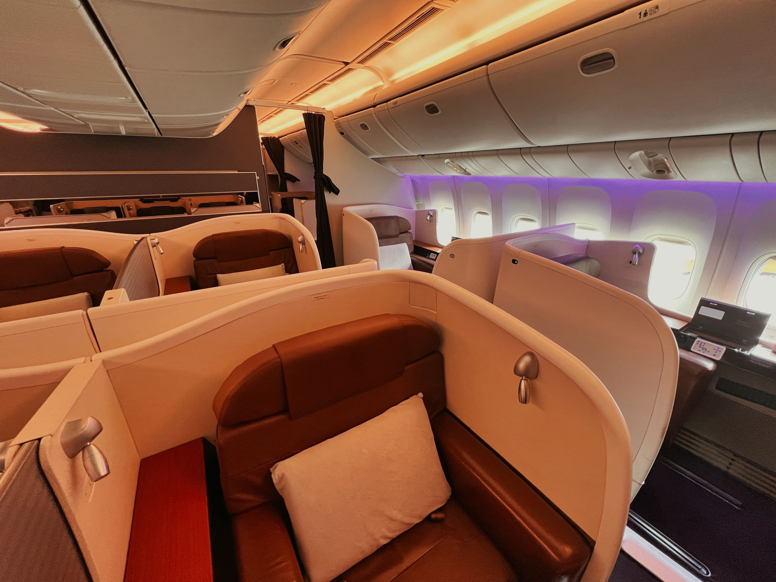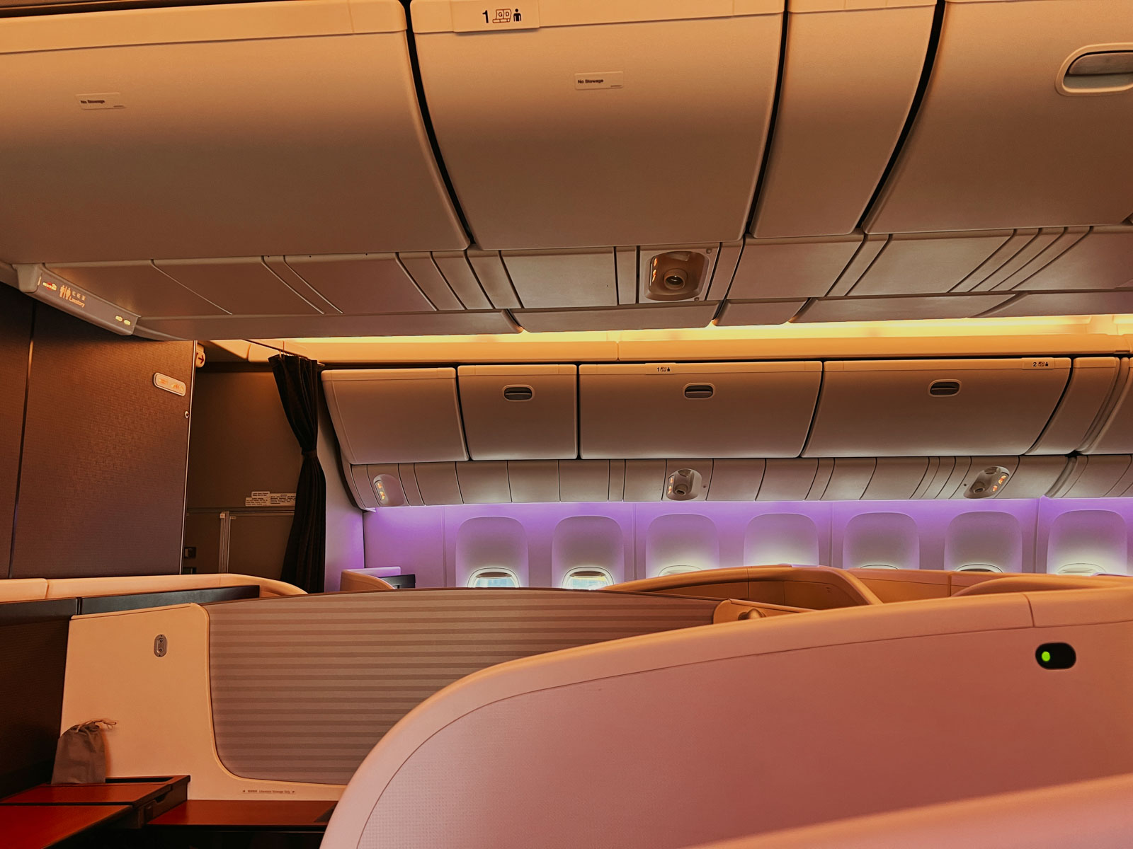 Im Grunde gefällt mir das Design und das Layout der Kabine wirklich gut. Die weißen Sitzschalen kombiniert mit dem braunen Leder der Sitze machen etwas her, und auch an Mood Lighting wurde gedacht. Durch die Farbgebung und das eher warme Deckenlicht wirkt es längst nicht so modern wie zum Beispiel die Swiss First Class (Review: Swiss First Class Boeing 777-300ER Zürich – Tokio Narita) mit der ich nach Tokio gekommen bin, aber auch nicht altbacken.