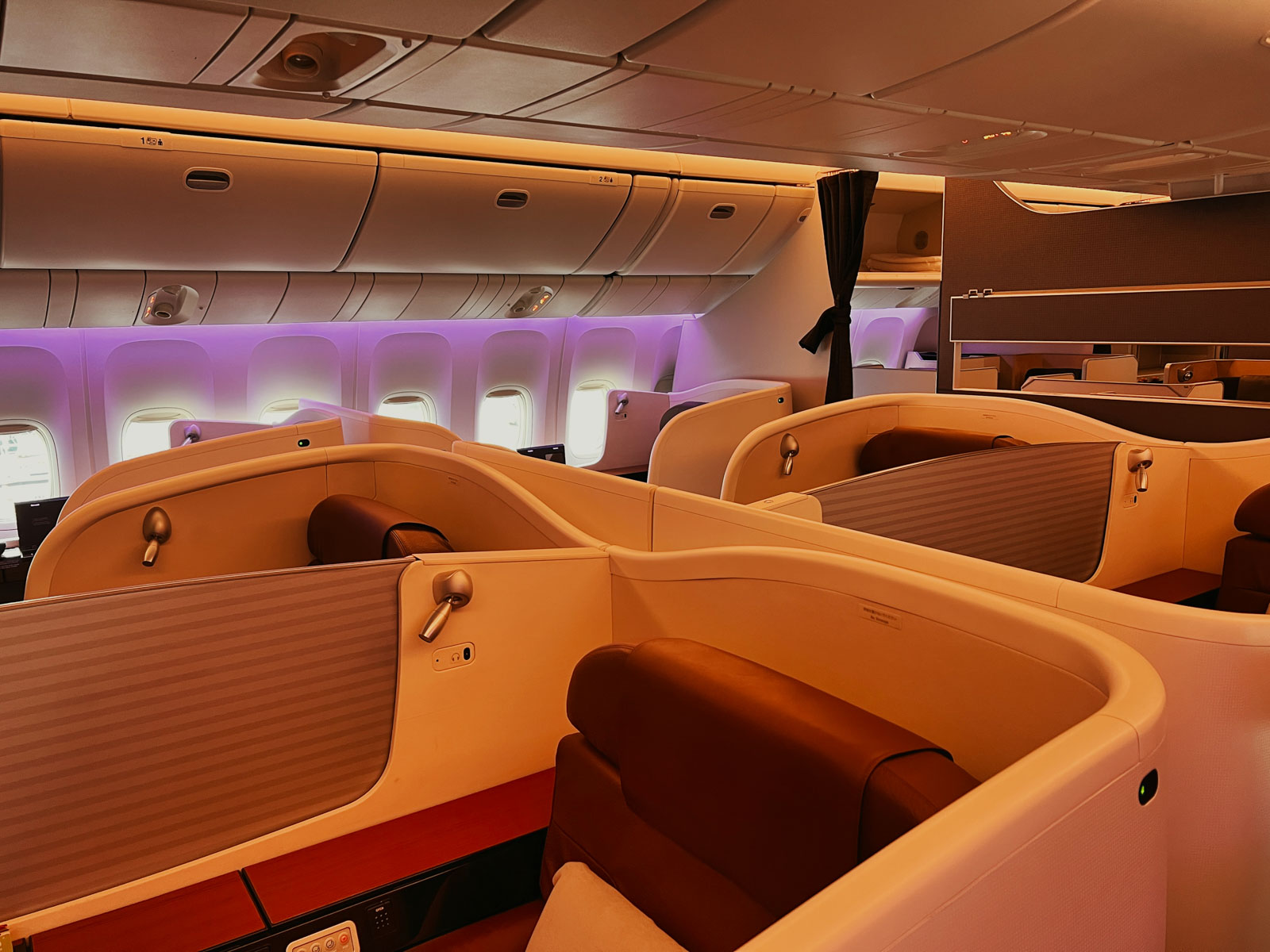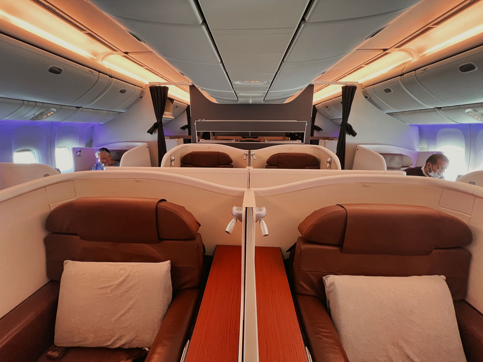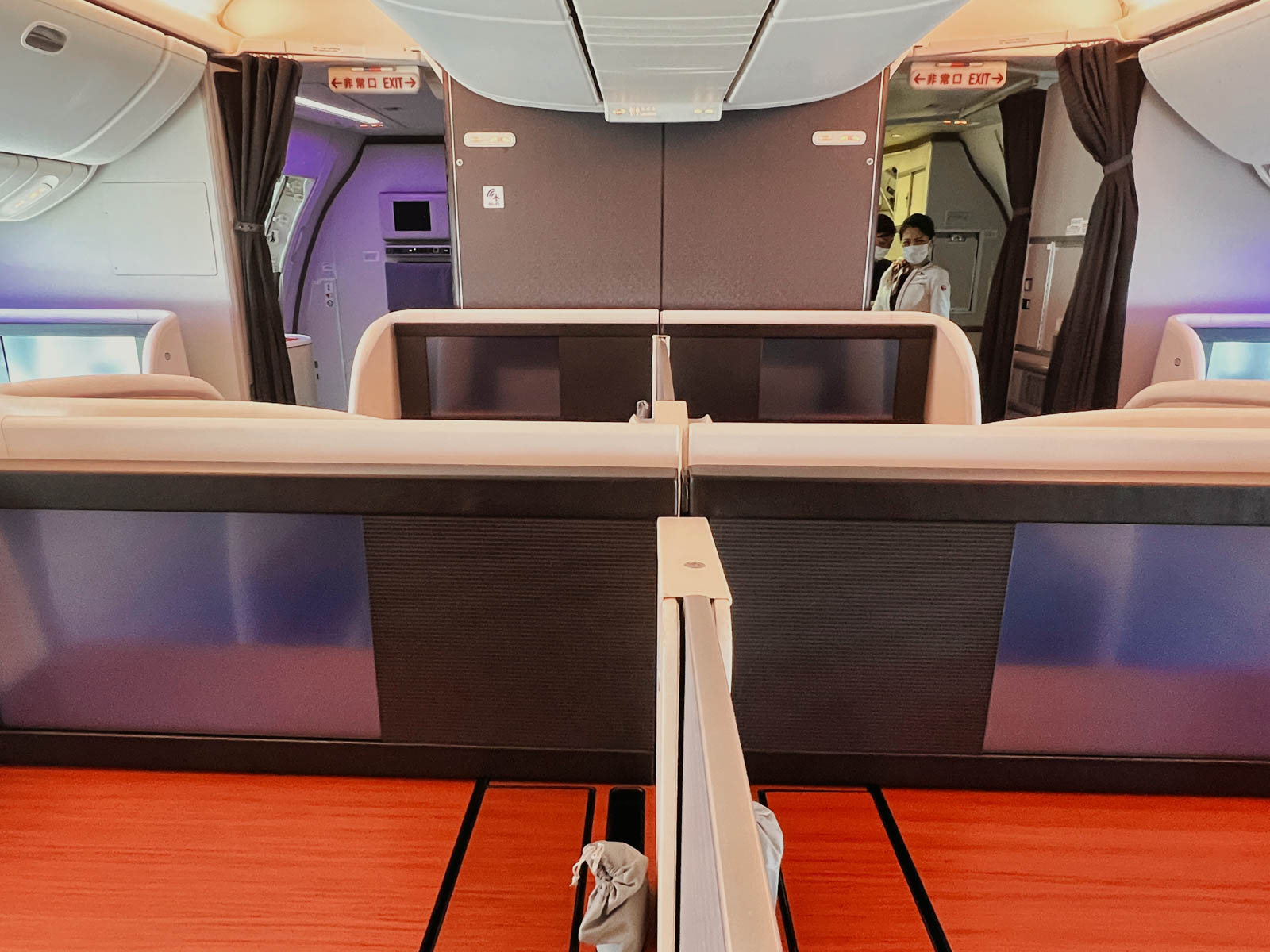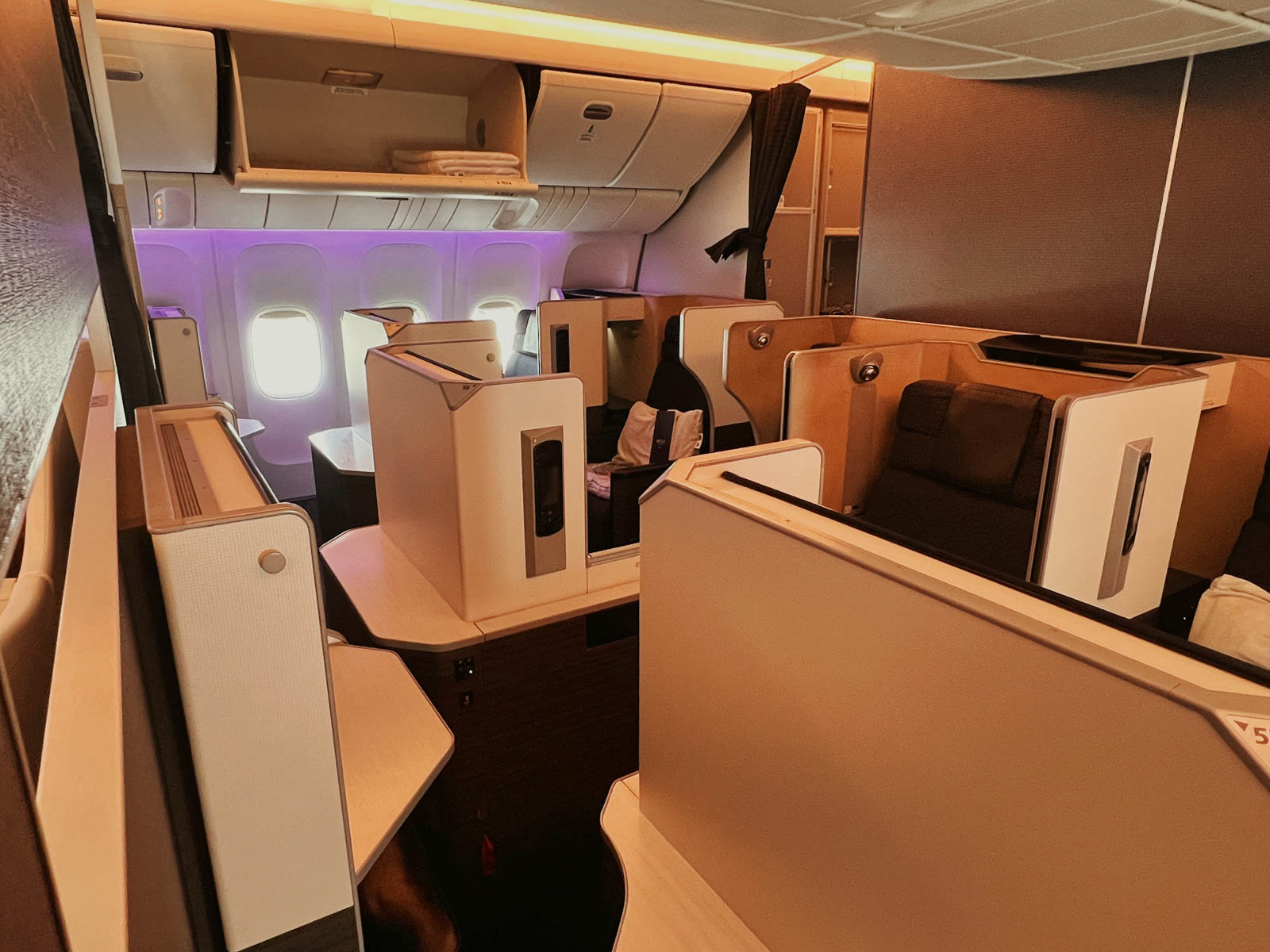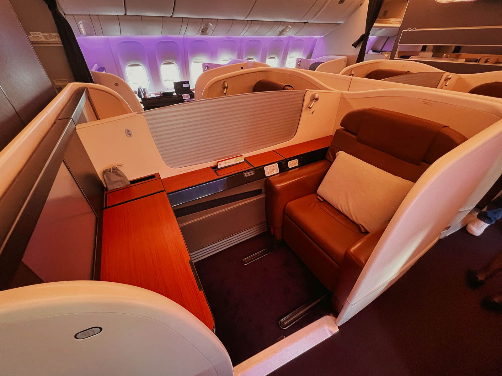 Im Grunde gefällt mir das Design und das Layout der Kabine wirklich gut. Die weißen Sitzschalen kombiniert mit dem braunen Leder der Sitze machen etwas her, und auch an Mood Lighting wurde gedacht. Durch die Farbgebung und das eher warme Deckenlicht wirkt es längst nicht so modern wie zum Beispiel die Swiss First Class (Review: Swiss First Class Boeing 777-300ER Zürich – Tokio Narita) mit der ich nach Tokio gekommen bin, aber auch nicht altbacken.