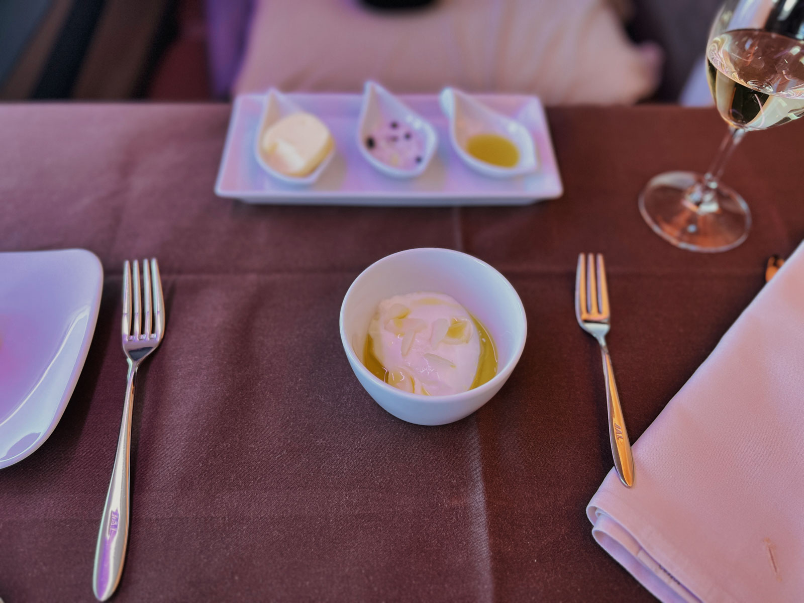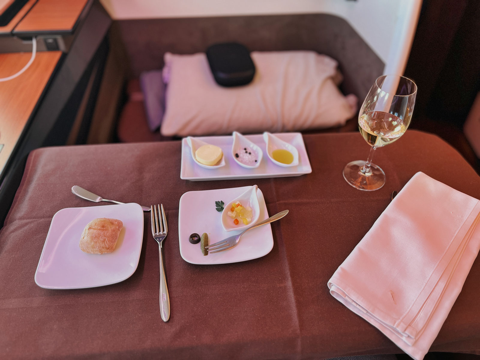 Schon beim Einsteigen war mir klar, dass die Crew sensationell sein würde, was sich dann auch bestätigt hat. Während wir am Gate auf das Boarding completed warteten gab es das erste Glas Champagner. Als wir dann die Reiseflughöhe erreicht hatten ging es los mit dem Programm. Es gibt durchaus Dine on Demand, aufgrund der Dauer die ich zu diesem Zeitpunkt bereits auf den Beinen war wollte ich aber direkt loslegen. Die Ablage unter/vor dem IFE Monitor ist dabei der Tisch welcher nach vorne gezogen und umgeklappt wird; also ein sehr großer und stabiler Tisch, welcher dann auch umgehend ein Tischtuch erhält.