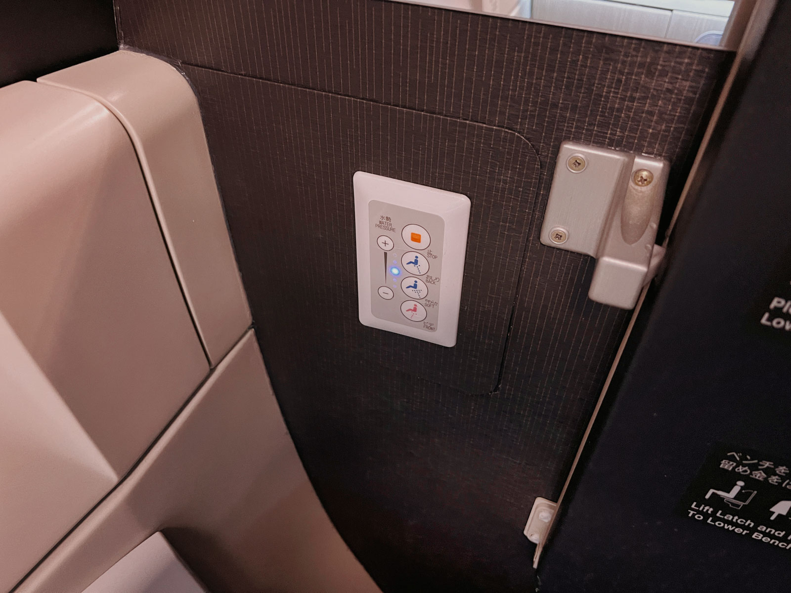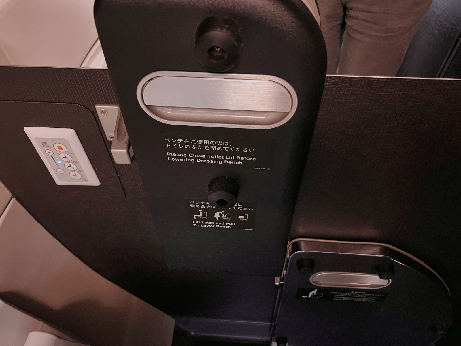 Für die acht Passagiere der First Class stehen zwei Bäder in der Boeing 777-300ER von Japan Airlines zur Verfügung; beide befinden sich ganz vorne in Richtung Cockpit, jeweils eines auf der linken und rechten Seite. Die Bäder sind an sich nichts Außergewöhnliches was das Design bzgl. First Class betrifft, waren jedoch zu jeder Zeit makellos sauber. Natürlich darf bei einer Airline aus dem Land der aufgehenden Sonne das japanische WC nicht fehlen.