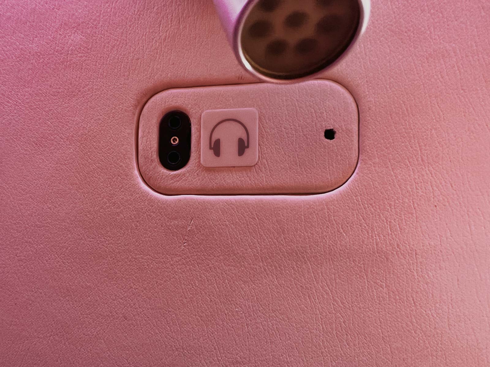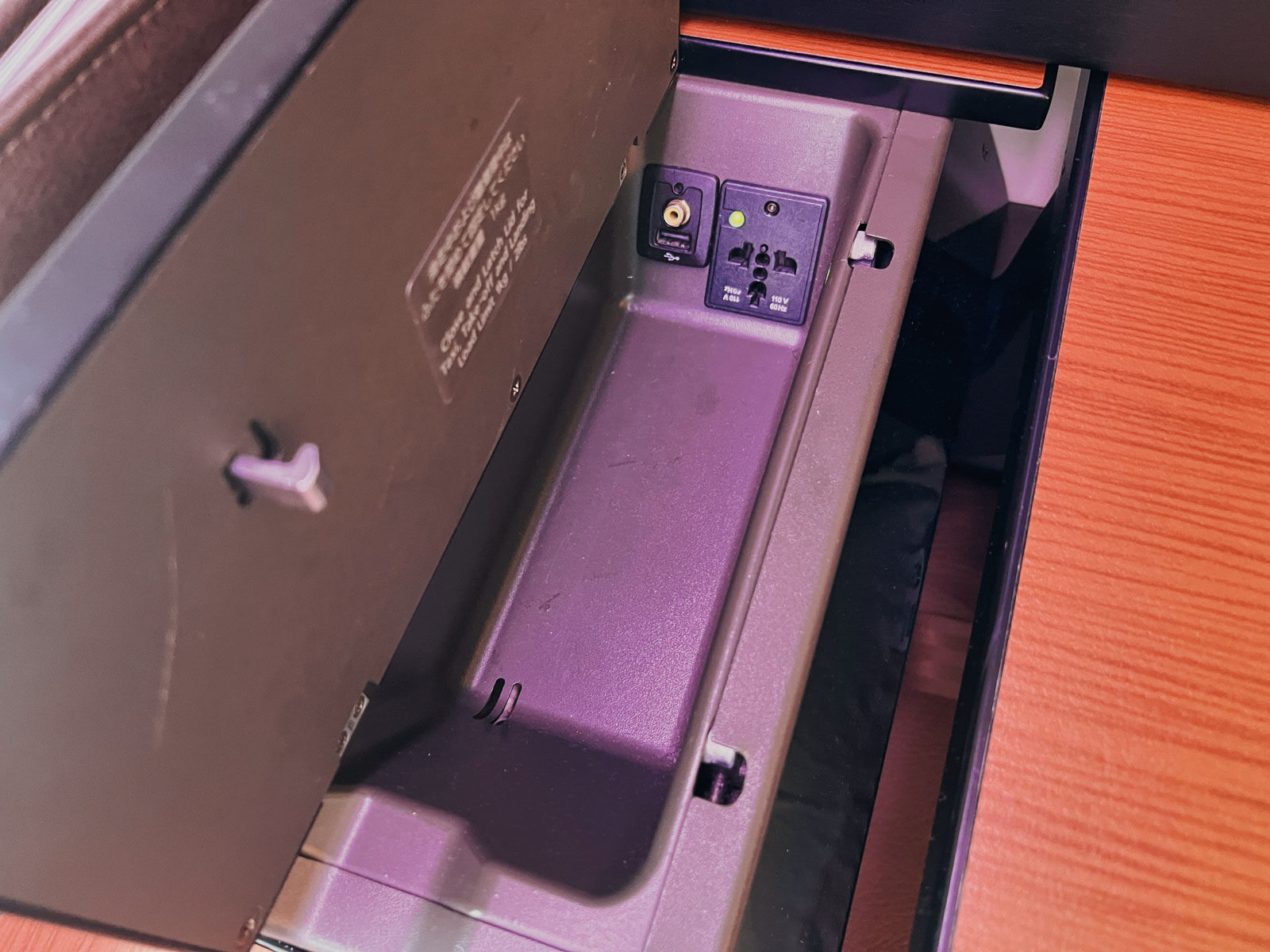Im vorderen linken Bereich beim IFE Monitor gibt es noch ein weiteres kleines Fach mit Stromanschluss. Hier lässt sich zwar der Stecker einstecken, aber für die heutigen Smartphones ist das Fach zu klein, so dass es außerhalb abgelegt werden muss.