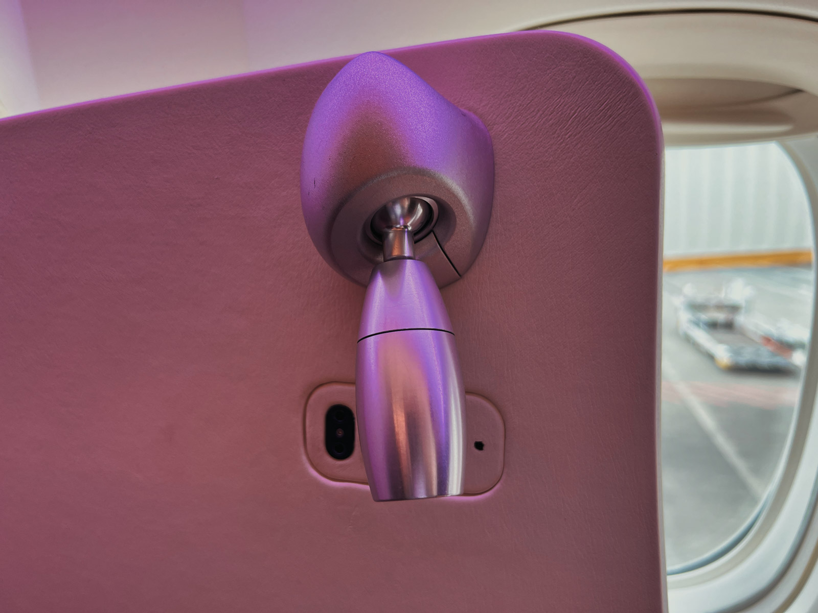 Auf der dem Gang abgewandten Seite gibt es eine ganze Reihe an Bedienelementen und Staufächern. Zum einen sind da die Schnelleinstellungen für die Sitzpositionen – aufrecht, relax, und flach – und dann gibt es daneben noch die Einstellungen für eine exakte Justierung der einzelnen Sitzelemente wie zum Beispiel der Rückenlehne, den gesamten Sitz, oder auch eine Massagefunktion. Oberhalb dieser Sitzeinstellungen war der IFE Controller sowie ein flaches Staufach bzw. ein kleiner Spiegel untergebracht.
