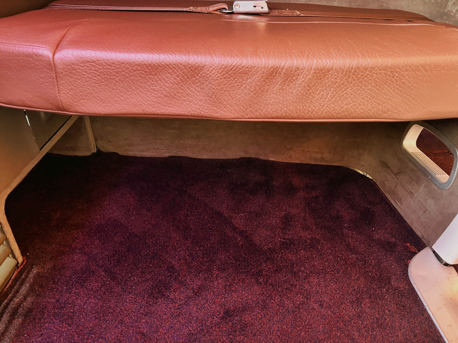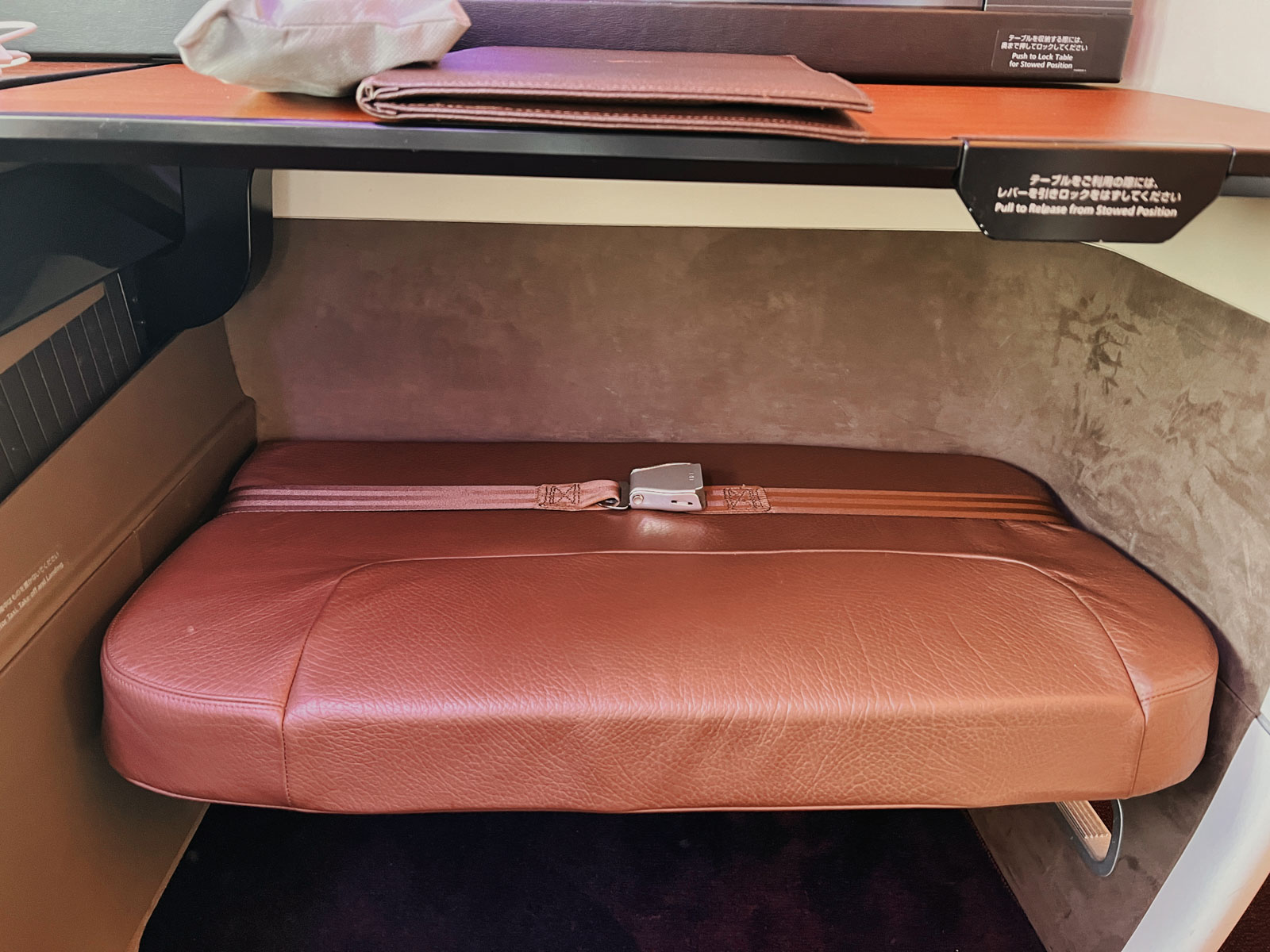 Unterhalb des IFE Monitors befindet sich der Ottoman, ebenfalls aus braunem Leder. Dieser kann auch als Buddy-Seat benutzt werden, so dass ihr zusammen Essen könnt falls gewünscht. Unterhalb des Ottomans ist genügend Platz für einen Trolley sowie zusätzlich ein Paar Schuhe vorhanden.