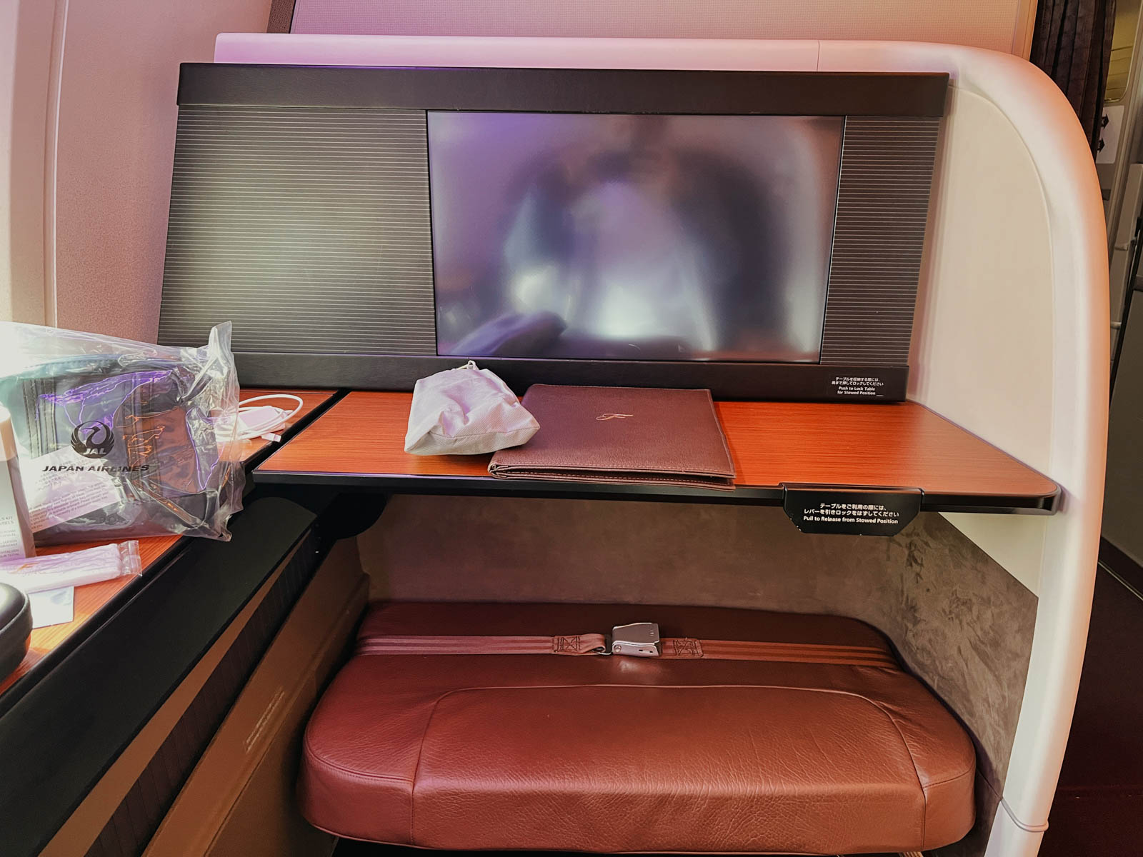Es lässt sich nicht leugnen, dass man merkt, dass das First Class Produkt von JAL bereits einige Jahre auf dem Buckel hat – vornehmlich aber der Farbgebung der Kabine bzw. den eher kleinen IFE Monitoren und deren umständliche Bedienung. Von Abnutzung hingegen merkt man hier nicht viel, die Instandhaltung war absolut hervorragend, da habe ich schon bei zweijährigen Produkten mehr Gebrauchsspuren gesehen. Übrigens soll per Ende diesen Jahres mit dem Airbus A350-1000 auch eine neue First Class den Weg zu Japan Airlines finden, und zwar in einer 1-1-1 Anordnung verteilt auf zwei Reihen. Bis alle Maschinen ersetzt werden dürfte es aber noch dauern, deshalb dürfte dieser Review auch noch etwas Relevanz haben.