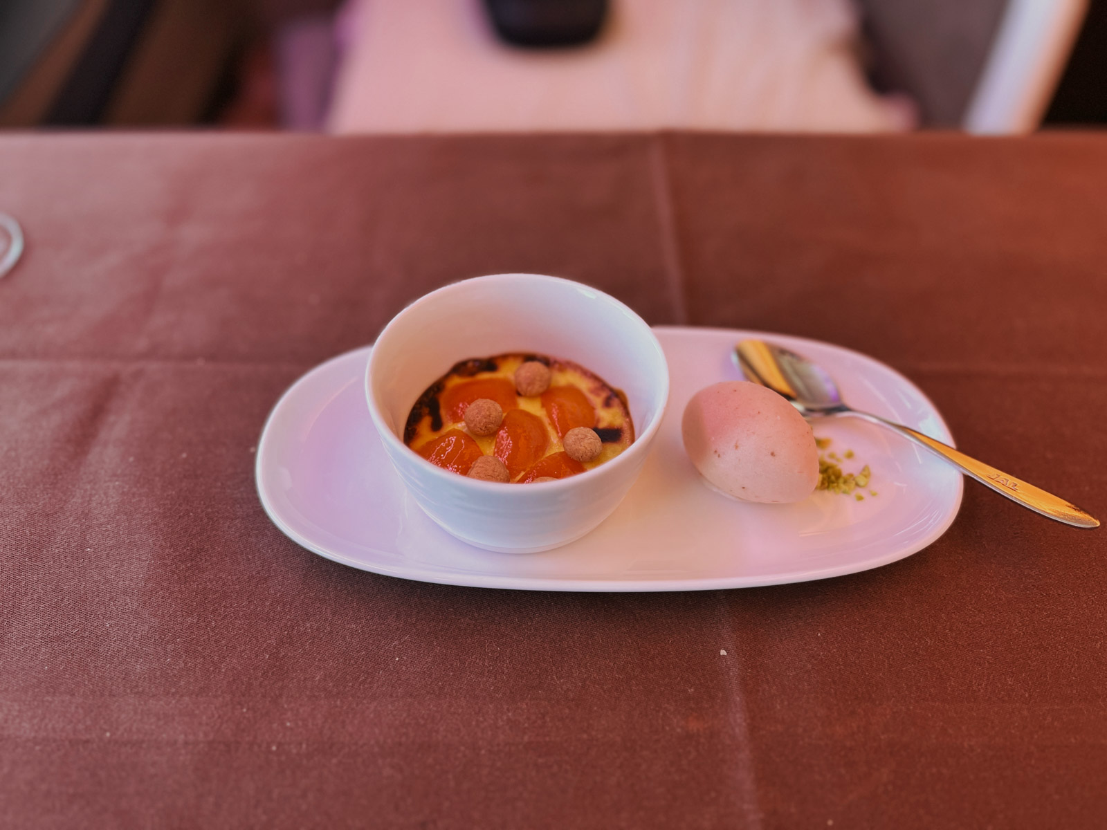 Zum Dessert gab es dann schließlich noch ein sogenanntes Kumquat Clafoutis mit Milcheis, eine Art Creme mit Alkohol und Aprikosen. Dadurch, dass das Essen bei Japan Airlines eher aus vielen kleineren Portionen/Beilagen besteht habe ich es tatsächlich geschafft mal nicht zu viel zu essen, und mit dem Wissen jederzeit etwas von der Karte bestellen zu können, oder mir aus der nett dekorierten Galley etwas zu holen, war das kein Problem.