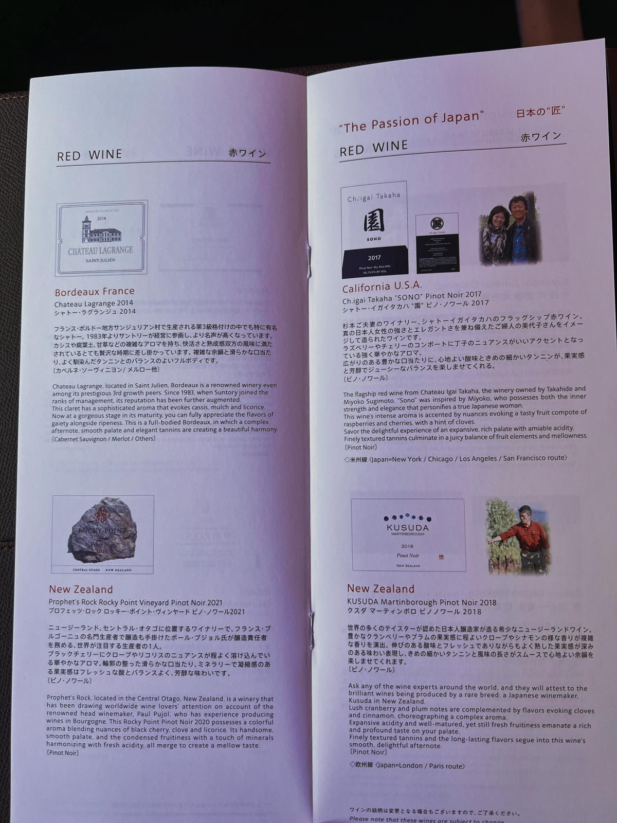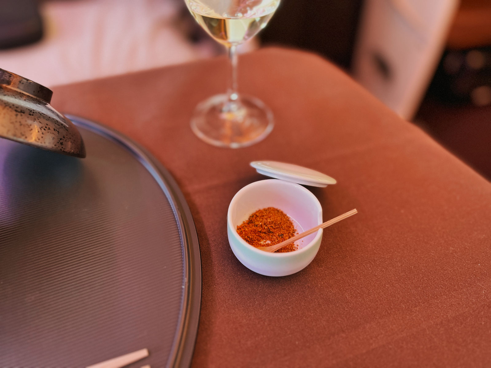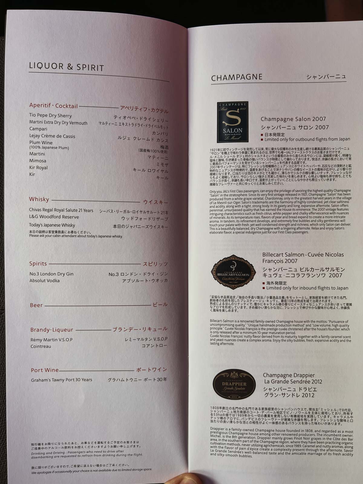 Darauf folgte dann direkt der Champagner – meines Wissens der teuerste Champagner, den eine Airline in der First Class serviert: Salon Blanc de Blancs von 2007. Die Flasche kostet im regulären Verkauf über 1.000 Euro, und ist nur auf abgehenden Flügen von Tokio im Angebot. Ob der durchschnittliche First Class Passagier weiß, was er da trinkt? Vermutlich nicht. Ich selbst wusste es auch nur von anderen Reviews und muss ehrlich sagen, dass der geschmackliche Unterschied zu einem guten Champagner für 50-100 Euro (für mich) nicht extrem ist; und verglichen mit einem Krug oder Dom Pérignon schmecke ich dann keinen Unterschied mehr. Witzig war das Erlebnis natürlich dennoch :)