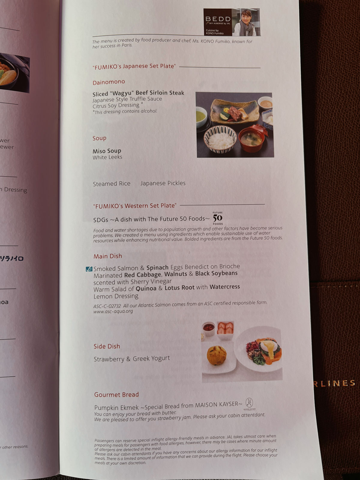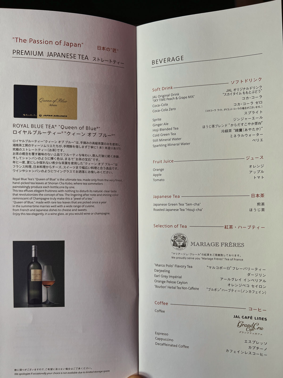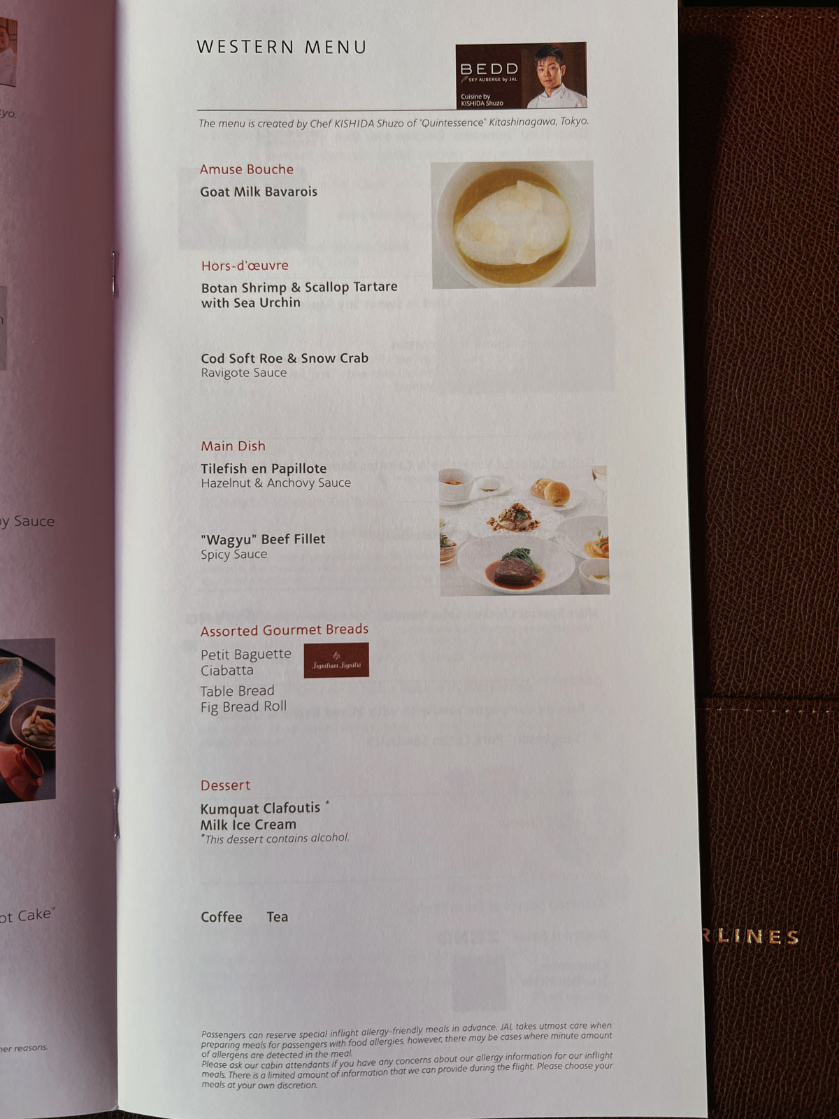 Man ist bei der Speisekarte nicht so breit unterwegs wie zum Beispiel Singapore Airlines mit ihrem Book the Cook Menu (Review: Singapore Airlines First Class Suites Airbus A380-800 Singapur nach London-Heathrow), aber eine mangelnde Auswahl gibt es definitiv nicht. Grundsätzlich stehen die Optionen Western/Japanese zur Verfügung, wobei man hier meines Wissens auch mixen kann wenn man möchte. Die verfügbaren Essens- und Getränkekarten für euren Flug lassen sich problemlos auch über die Webseite von JAL aufrufen.