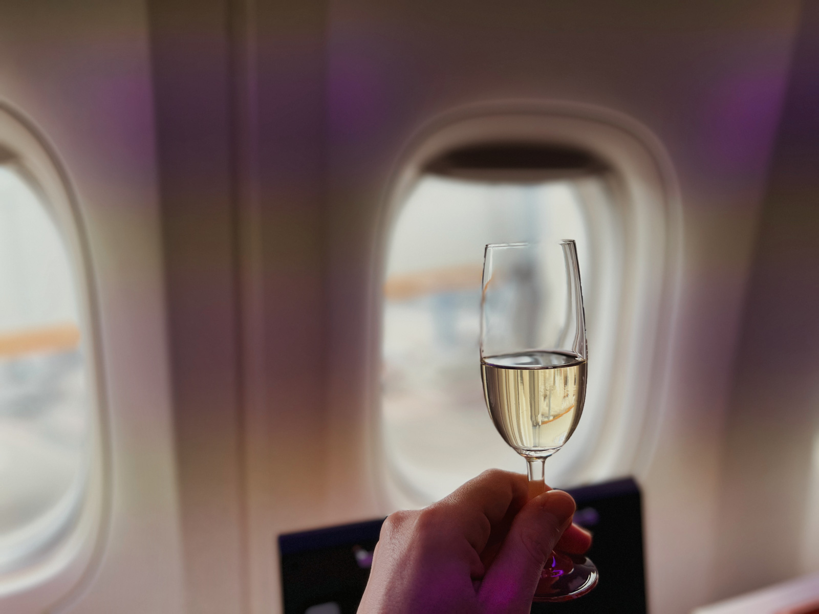 Nach ein paar weiteren Minuten startete das Boarding und die Passagiere der First Class wurden an Bord wärmstens von den beiden Flugbegleiterinnen willkommen geheißen. Es wurde sofort Hilfe beim Verstauen des Gepäcks angeboten und erklärt, dass heute nur vier Passagiere die First Class nutzen würden, entsprechend würden sie jedem Passagier zwei Sitze zur Verfügung stellen auf denen man sitzen/loungen bzw. schlafen könne, sofern man das möchte. Dazu wurde noch ein Champagner gereicht, allerdings ein anderer als in der Luft.