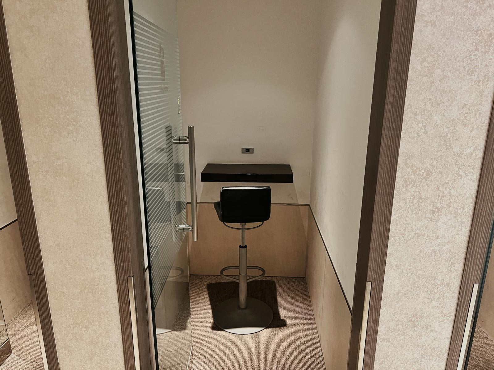 Auf der rechten Seite des Ganges gibt es insgesamt sechs Kabinen zum Telefonieren und/oder Arbeiten. Für eine längere Dauer vielleicht etwas eng, aber für ein kurzes Gespräch oder um etwas fertig zu machen ganz praktisch.