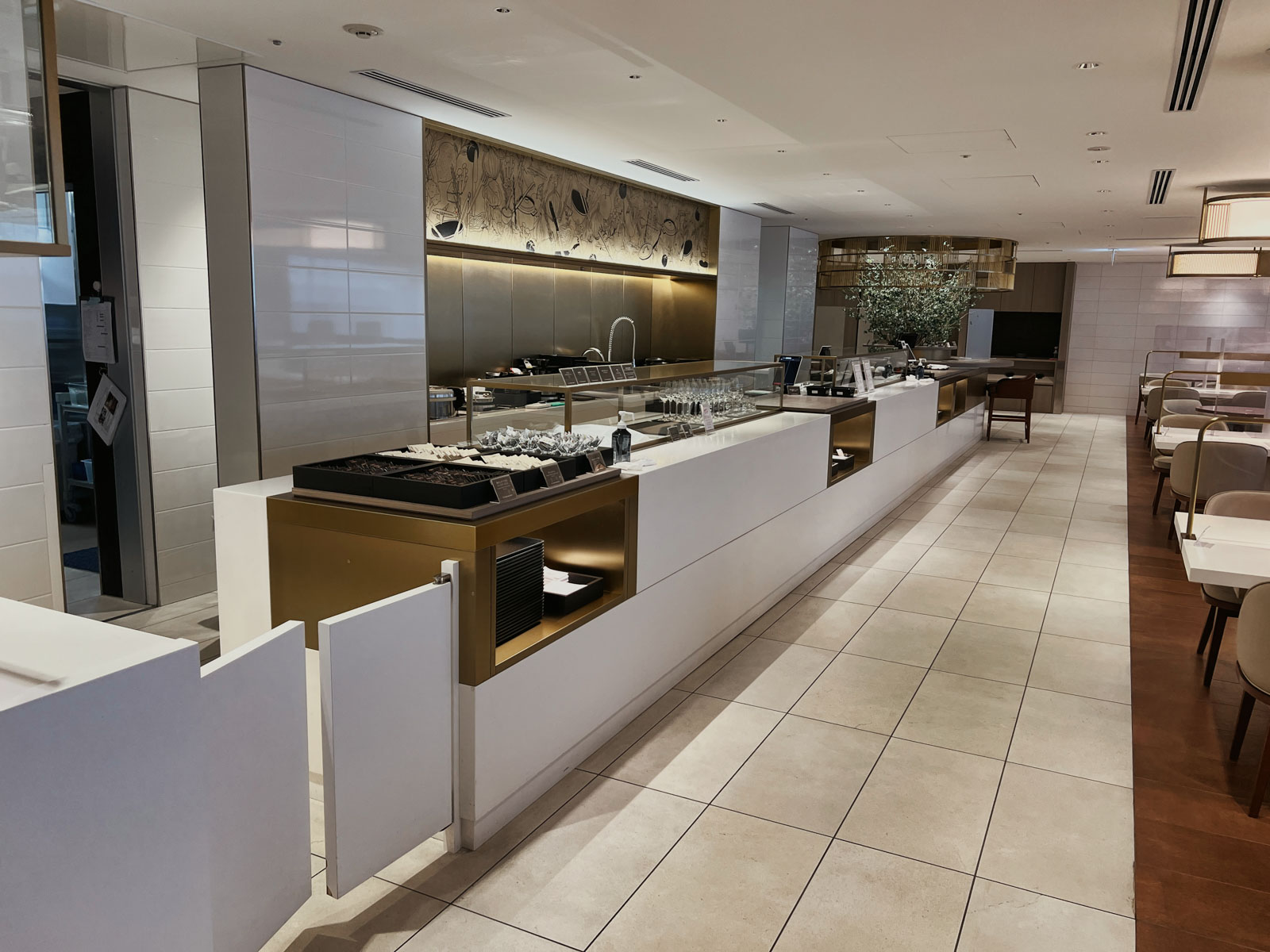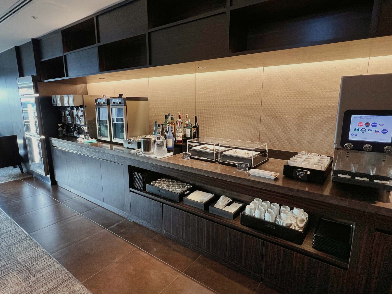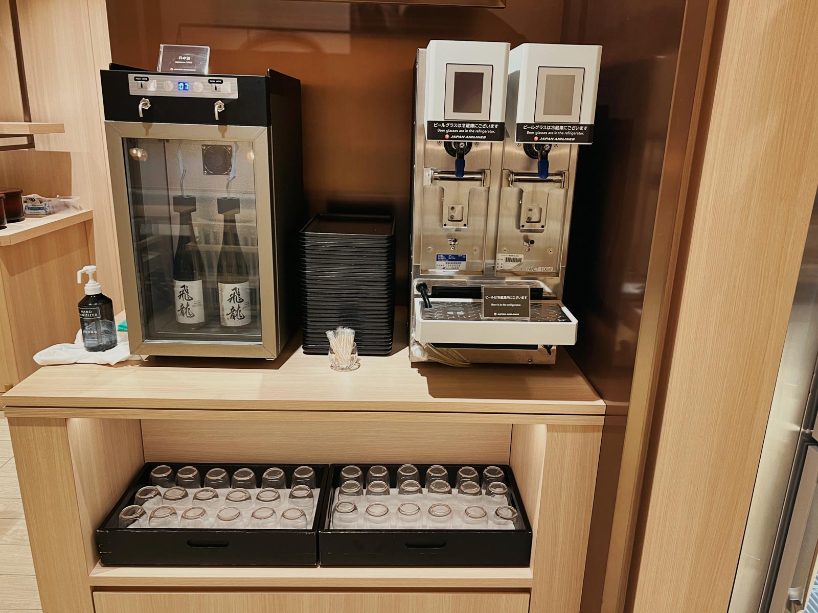 Im Grunde ist die Lounge bedient, aber an mehreren Stellen gibt es auch Selbstbedienungsstationen für Kaffee, Tee, Softdrinks und Alkohol. Der Wein und Champagner steht zwar teilweise offen da, aber sobald man sich hier bedienen möchte kommt ein Mitarbeiter und übernimmt das Einschenken. Das Japan gerade erst wieder die Grenzen geöffnet hat, haben sowohl der geschlossene Salon als auch die fehlenden Zeitschriften verdeutlicht.
