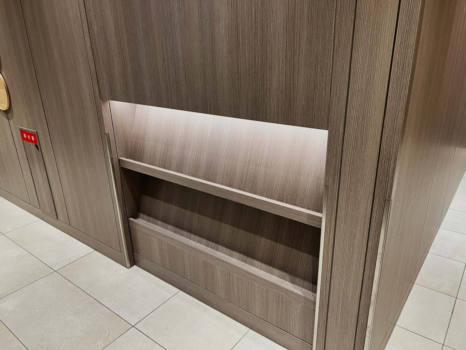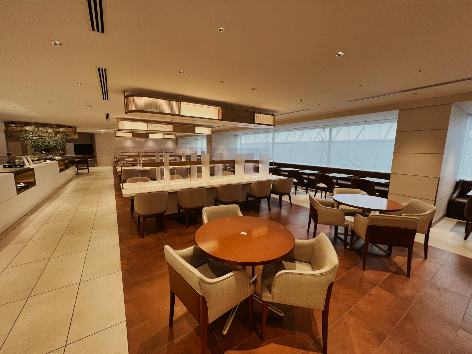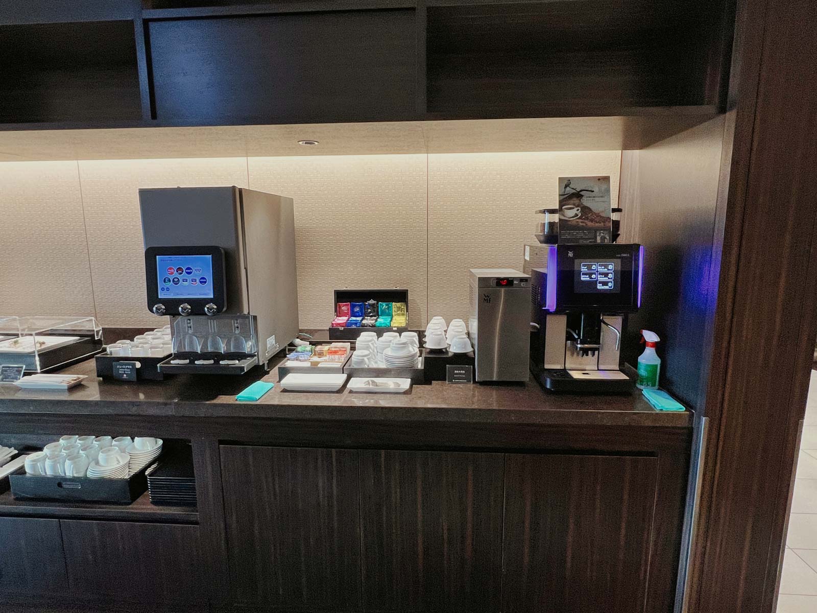 Im Grunde ist die Lounge bedient, aber an mehreren Stellen gibt es auch Selbstbedienungsstationen für Kaffee, Tee, Softdrinks und Alkohol. Der Wein und Champagner steht zwar teilweise offen da, aber sobald man sich hier bedienen möchte kommt ein Mitarbeiter und übernimmt das Einschenken. Das Japan gerade erst wieder die Grenzen geöffnet hat, haben sowohl der geschlossene Salon als auch die fehlenden Zeitschriften verdeutlicht.