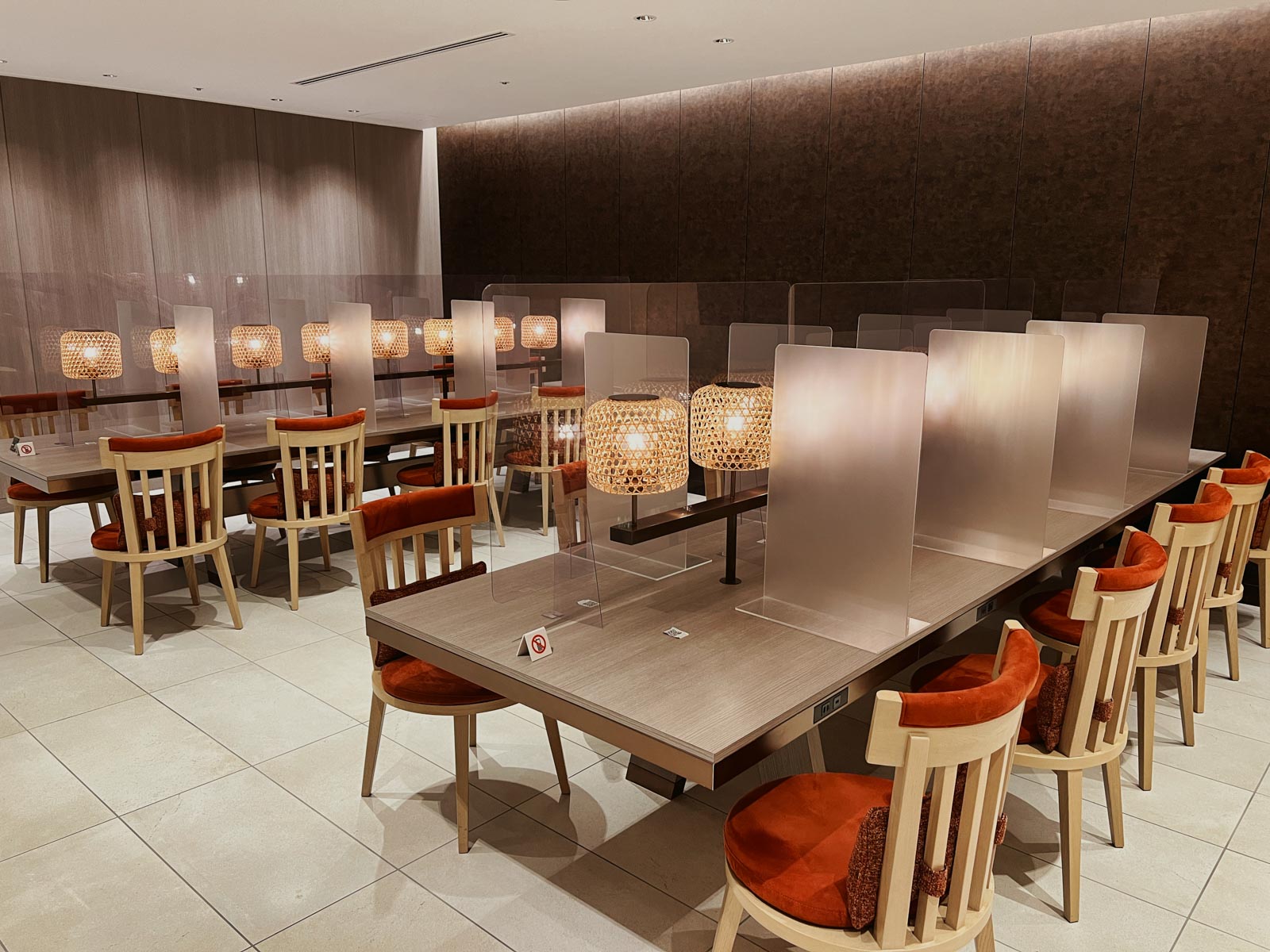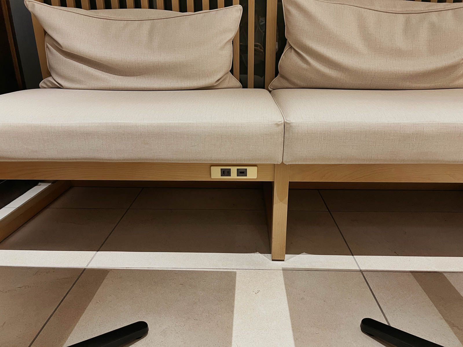 Quasi gegenüber der Theke im ersten Bild oben liegt die Sushi Bar sowie weitere Sitzmöglichkeiten. Es gibt fast an jedem Platz Lademöglichkeiten für Handy und Laptop, sodass man wirklich sitzen kann wo man möchte ohne sich taktisch platzieren zu müssen. Das helle Holz und die cremefarbenen Polster in diesem Bereich lassen die ansonsten sehr sterile Lounge etwas wohnlicher wirken.