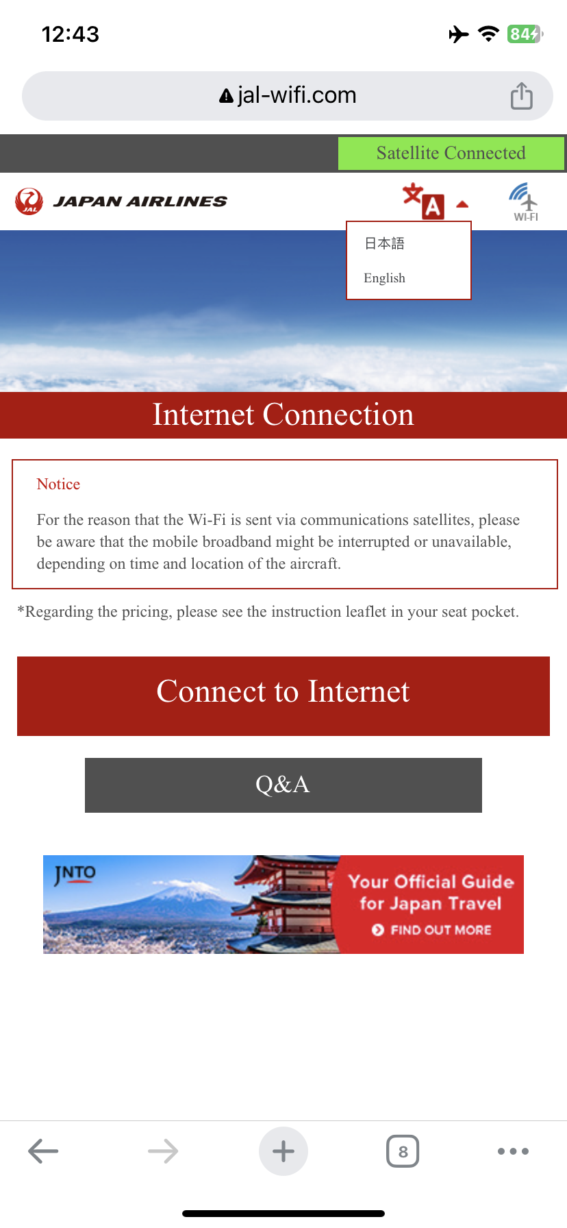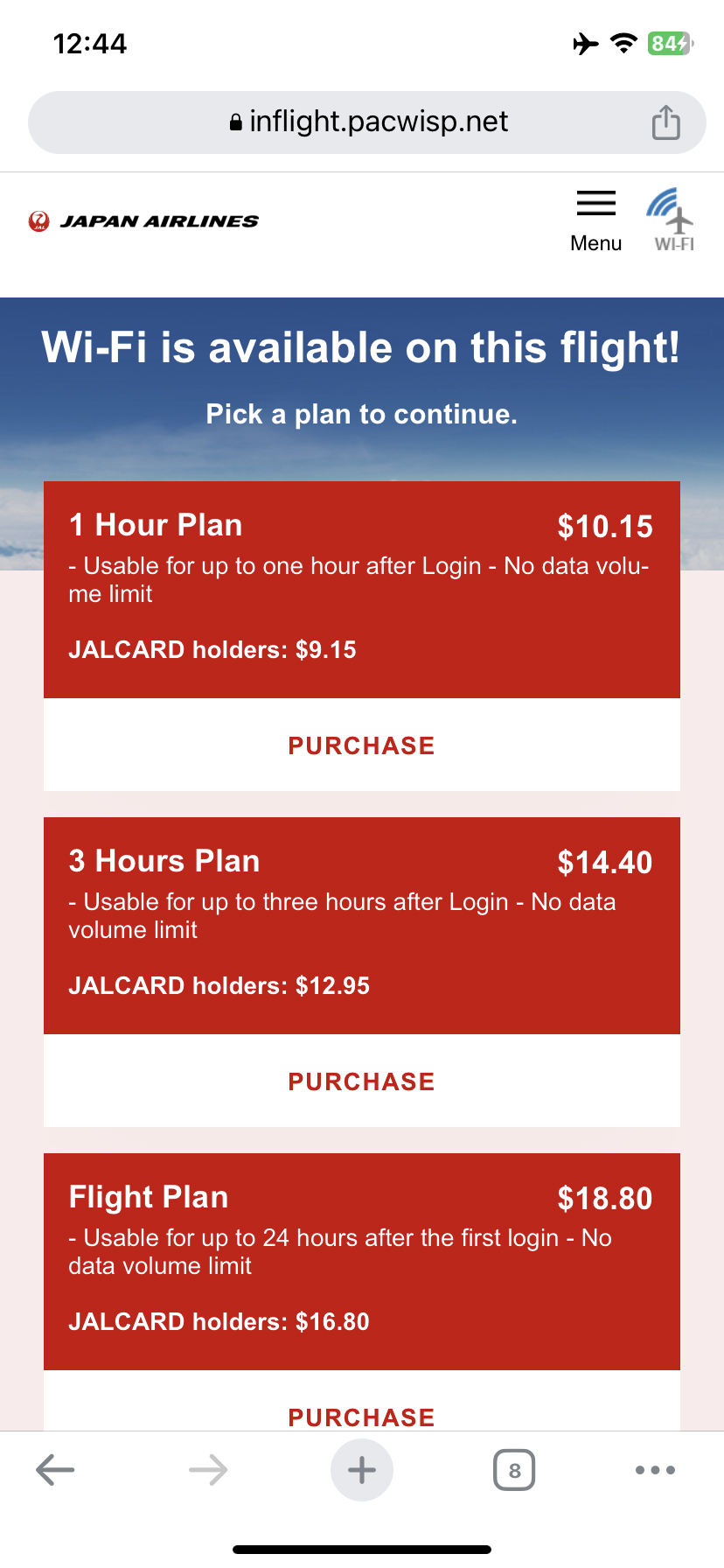 WiFi wurde auf der Kurzstrecke ebenfalls angeboten. Die Preise waren fast identisch mit ANA, jedoch minimal günstiger. Für drei Stunden verlangt Japan Airlines 14,40 USD, wohingegen ANA 16,95 USD von euch möchte. Ich habe kein WiFi für diesen Flug genutzt und kann euch daher nichts zu der Geschwindigkeit sagen.
