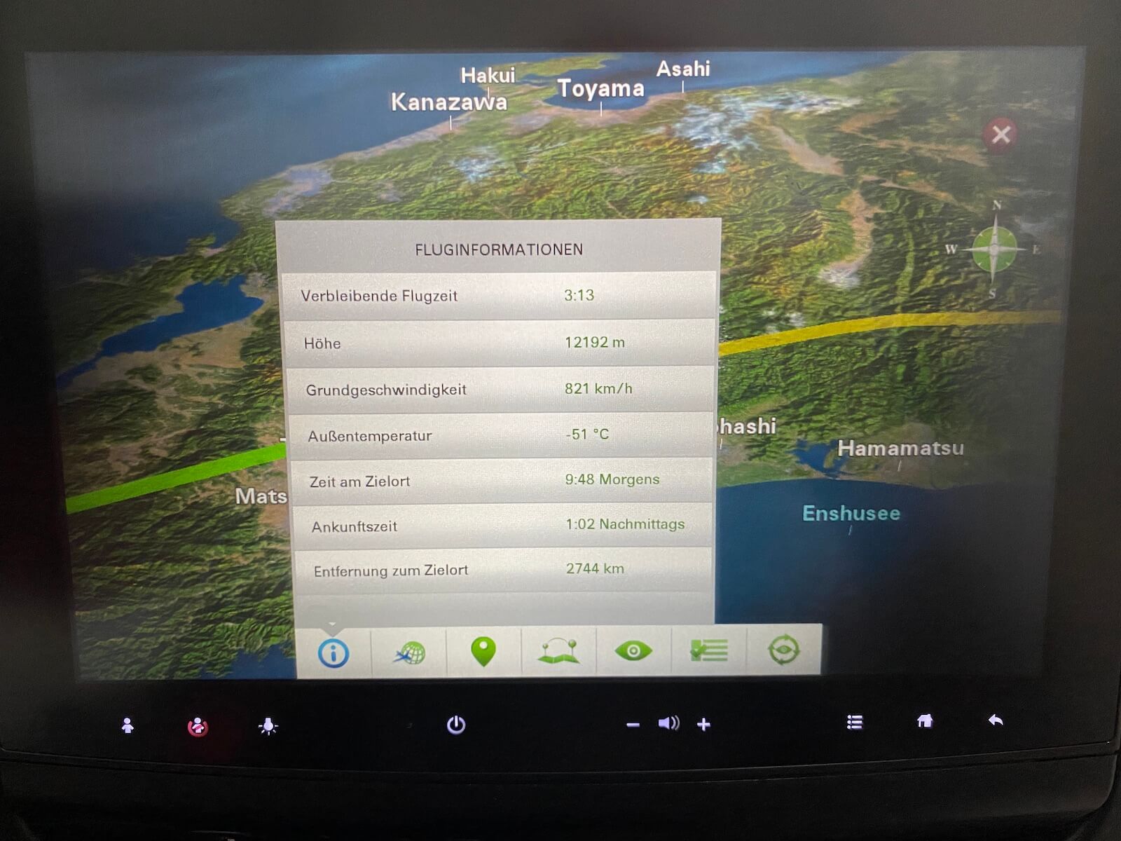 Das Entertainmentmenü gab es in deutscher Sprache und ich war erstaunt über die Anzahl an Filmen mit deutscher Tonspur. Der Monitor selbst war drei Zoll kleiner als der bei ANA und nicht so hochauflösend. Neben Filmen gab es nur ein kleines Angebot an Serien, Live TV oder Dokumentationen. Mehr Information zum Inflight Entertainment findet ihr auf der offiziellen Homepage von Japan Airlines