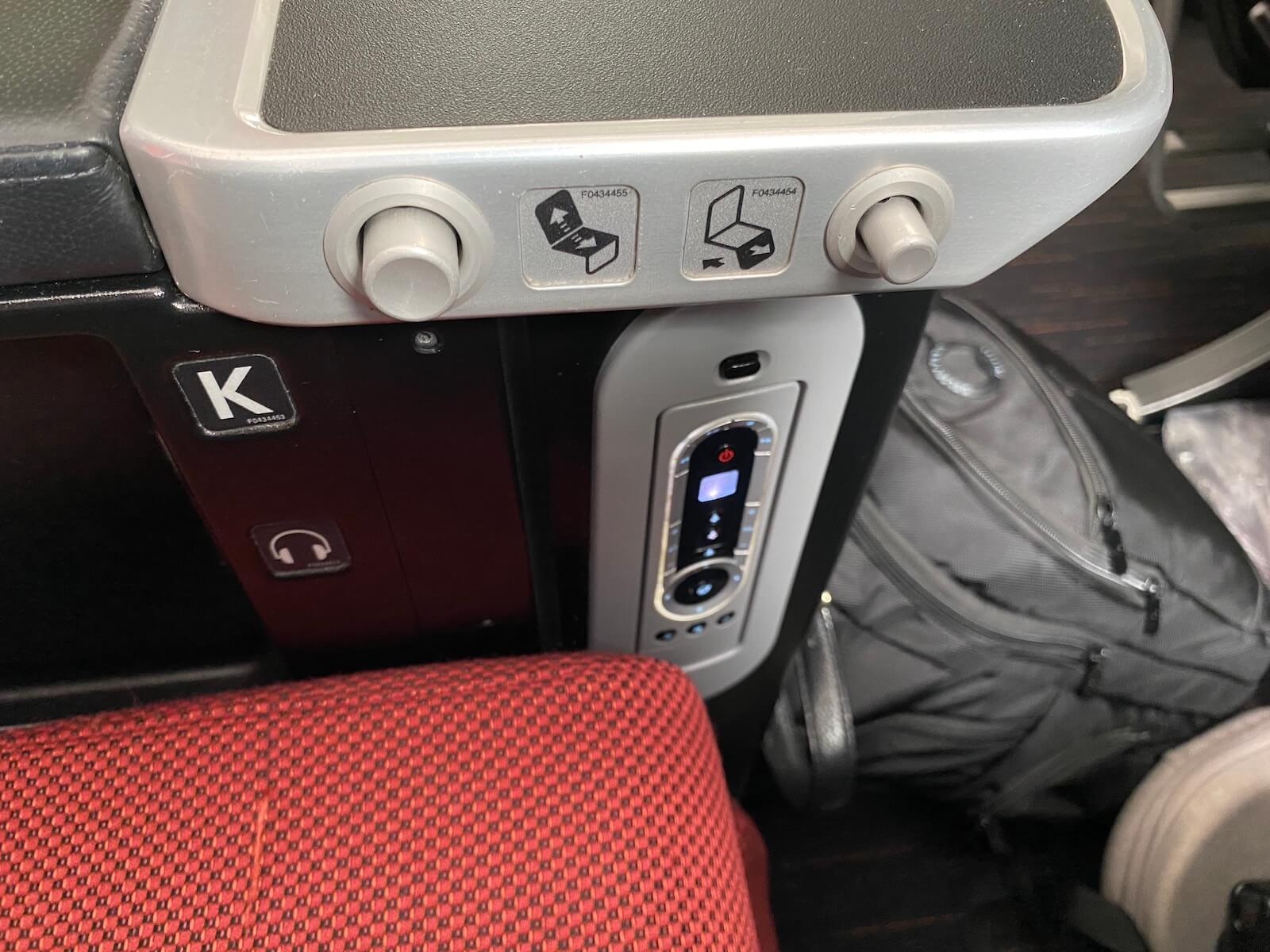 Die Sitzeinstellungen befinden sich auf der Innenseite der Mittelarmlehne. Darunter befindet sich der kleine Controller für den Monitor. Eine Fußstütze ist noch an der vorderen Schale verbaut. Die Kopfstütze kann ebenfalls verstellt werden. Zwischen den Sitzen ist eine kleine Trennwand zum Nachbarn hin angebracht, die ein wenig Privatsphäre bietet, aber auch nicht weiter störend ist, wenn man sich mit der Person neben einem unterhalten möchte.