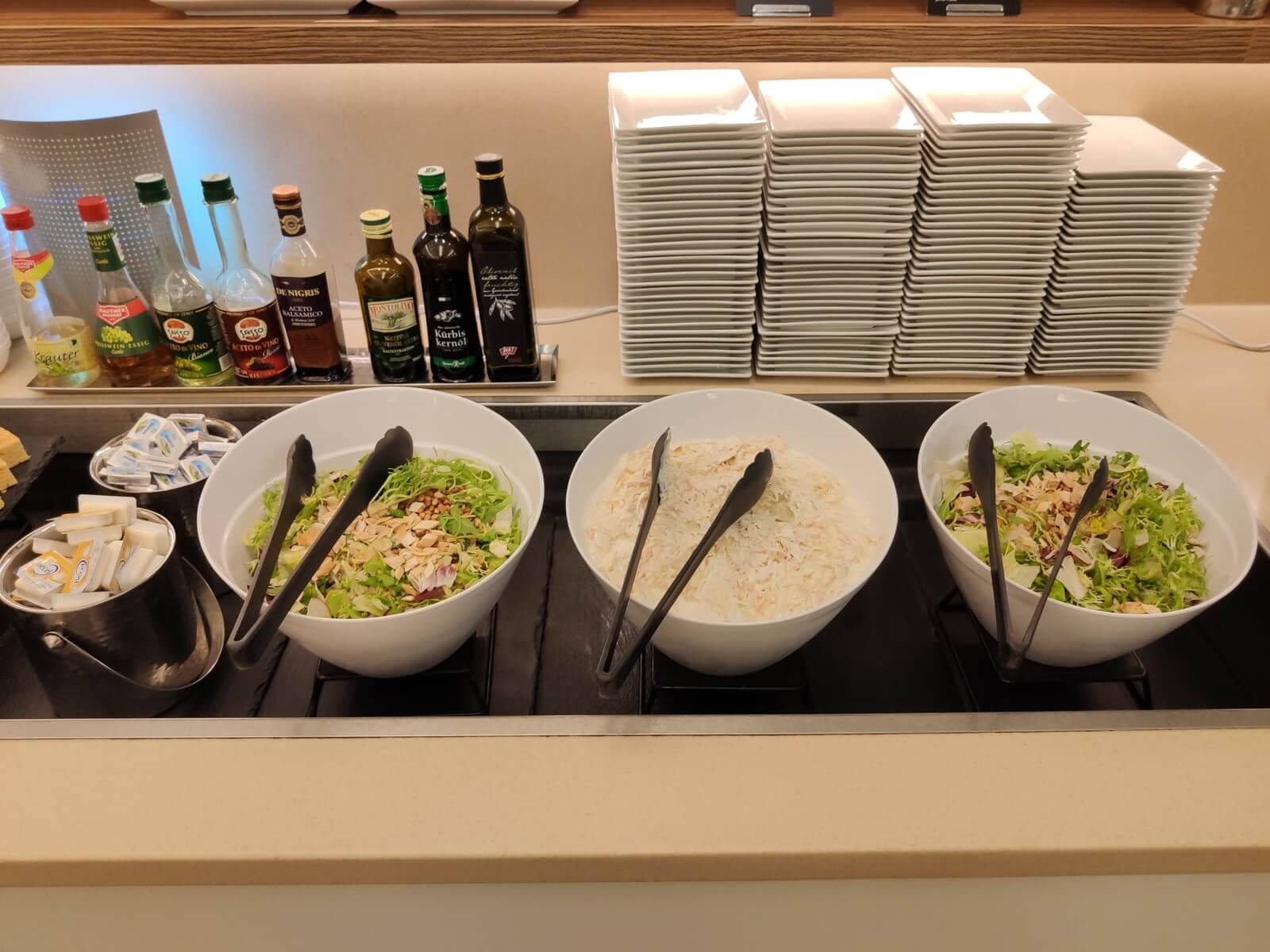 Wir besuchten die Lounge an einem Donnerstag Vormittag kurz vor 11 Uhr vor unserem Flug nach Göteborg. So gab es zunächst noch für 10 Minuten das übliche Frühstücksangebot – Crossaints, Semmeln (Brötchen), Käse und Schinken. Um Punkt 11 Uhr fand der Wechsel statt, das Frühstück wurde abserviert und das warme Mittagessen gebracht. Als Suppen gab es einerseits eine Rindsuppe sowie andererseits eine köstliche Karotten-Ingwer-Cremesuppe. Letztere war tatsächlich hervorragend und man konnte wirklich schmecken, dass die Suppe mit frischen Zutaten zubereitet wurde.