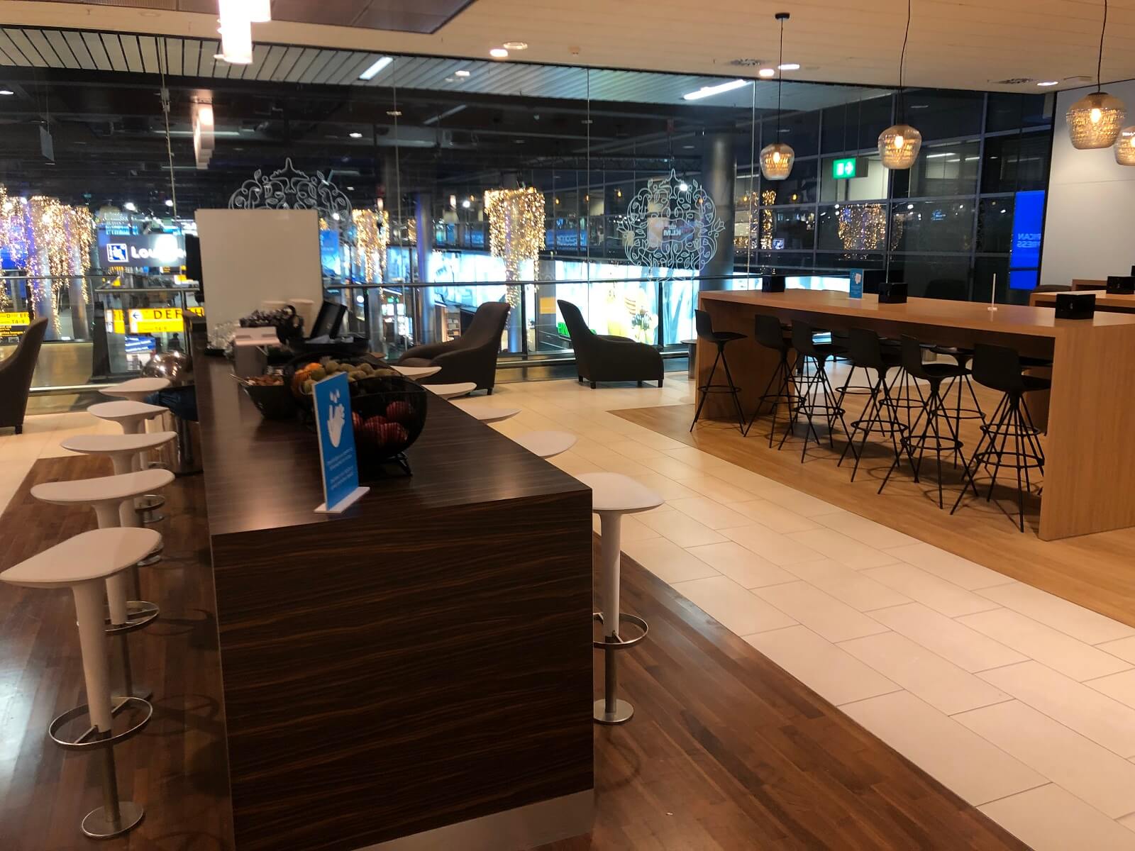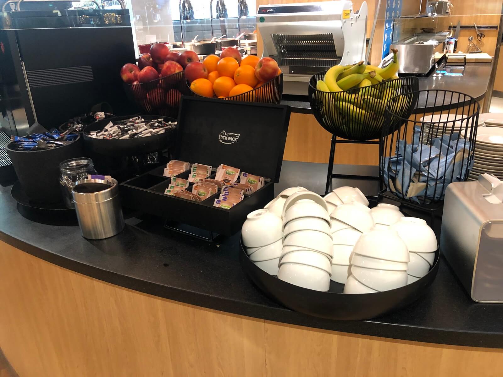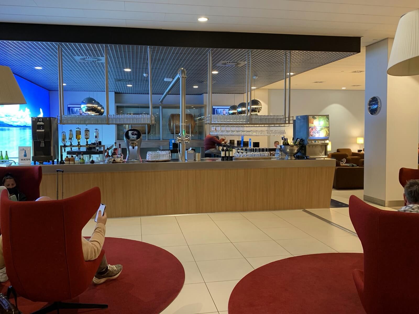 Im Bereich der Business Area werden normalerweise auch Getränke und Essen angeboten. Allerdings sind die Kaffeeautomaten aktuell ausgeschaltet und es liegen dort lediglich ein paar Süßigkeiten und Orangen aus. Kaffee und Tee bekommt ihr ebenfalls im Buffetbereich in der Mitte der Lounge. Hochprozentige Getränke, wie Gin, Vodka, Sekt oder Wein werden im hinteren Teil der Lounge, in einem kleinen Bar Bereich, angeboten. Hier gilt ebenfalls Selbstbedienung. Das Bier kommt aus einem Heineken Zapfhahn, was leider nicht meinen Geschmack trifft.