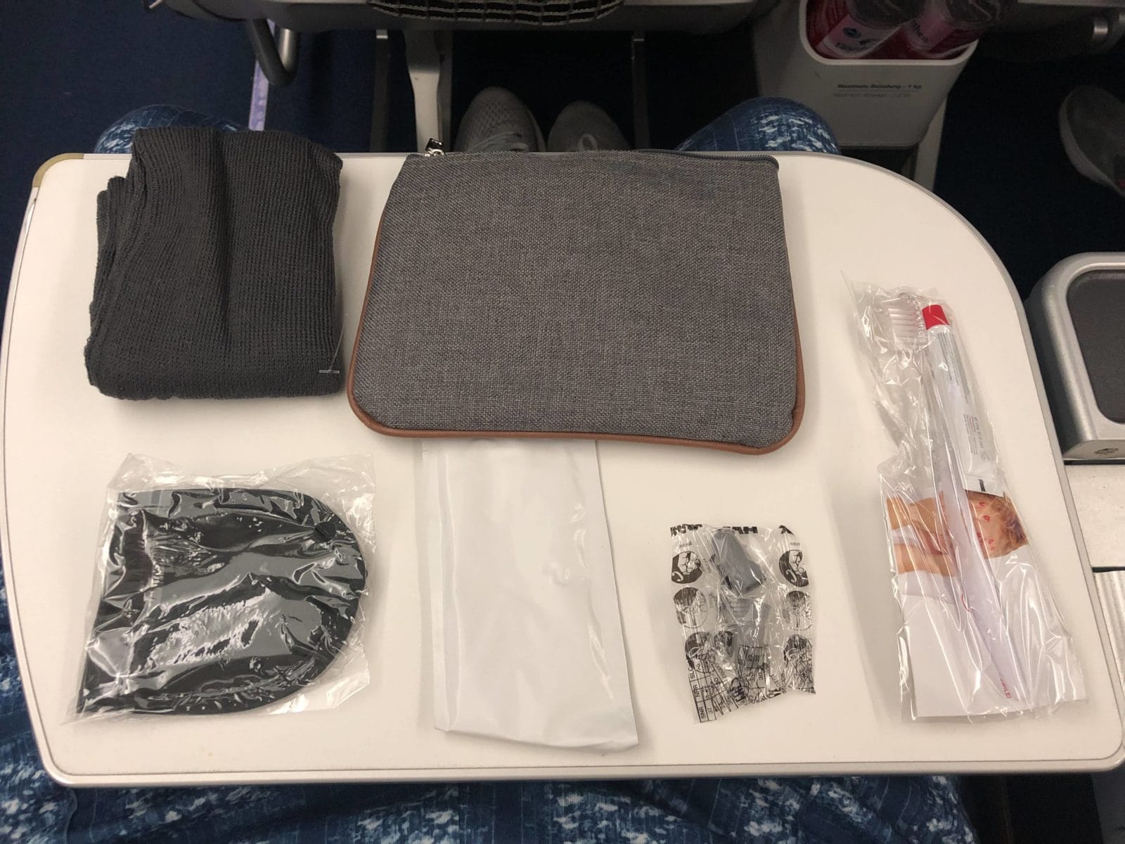 Beim Betreten der Kabine befand sich ein Kissen und eine dünne Decke auf dem Sitz. Es handelt sich dabei um die gleiche Decke, die ihr auch in der Economy Class bekommt. Seitlich des Sitzes befindet sich der Controller, der keinen integrierten Bildschirm hat. In dem Ablagefach daneben ist ein kleines Amenity Kit verstaut. Ihr habt richtig gelesen: Im Vergleich zur Economy Class erhaltet ihr in der Premium Economy ein kleines Amenity Kit. In dem Amenity Kit befinden sich Ohrstöpsel, Schlafmaske, Socken, Erfrischungstuch und Zahnbürste. Auf dem Rückflug gab es das Amenity Kit in Form einer Tragetasche. Ich meine mich zu erinnern, dass es fünf verschiedene Muster gibt: Die Golden Gate Bridge, die Skyline von New York, Frankfurt, Amsterdam und noch ein weiteres.