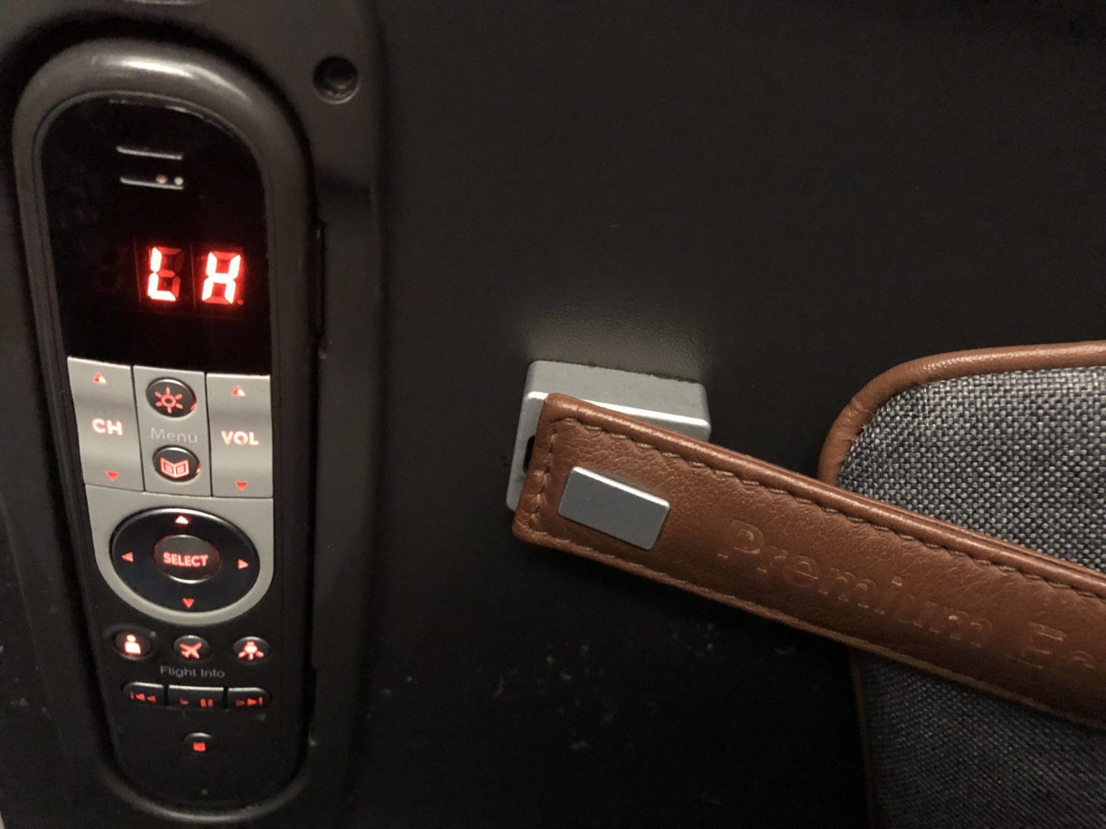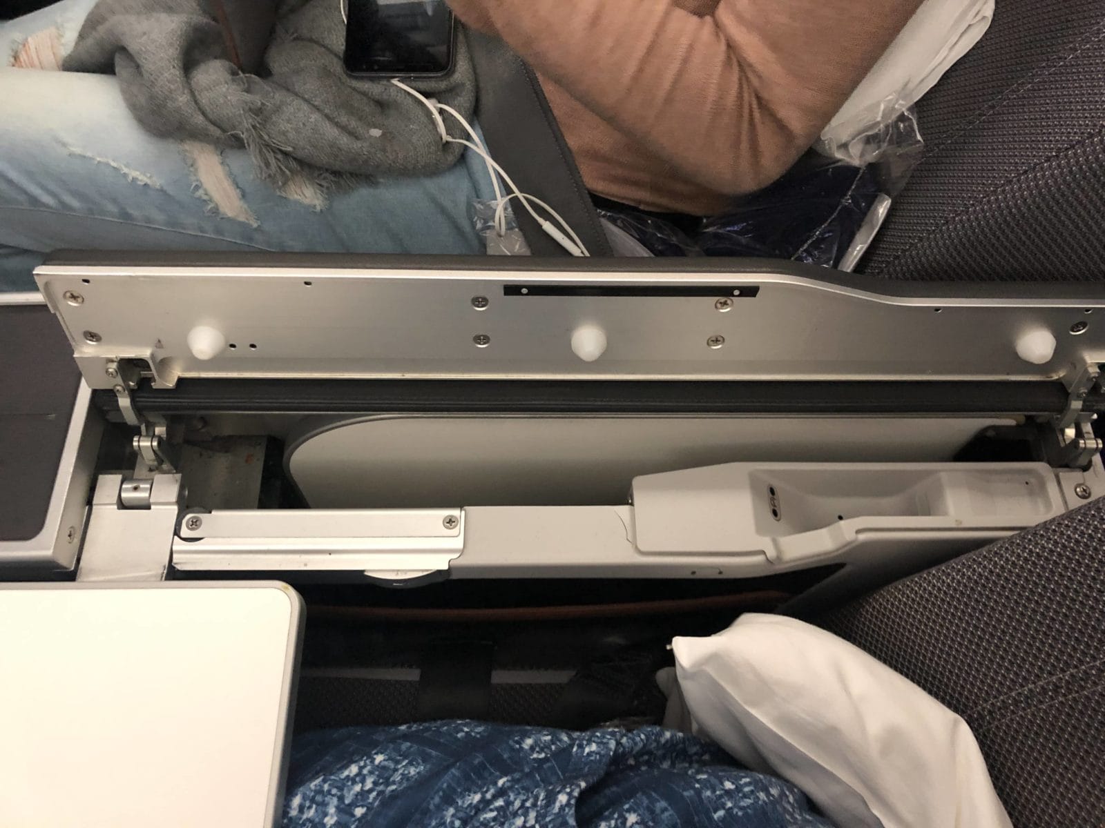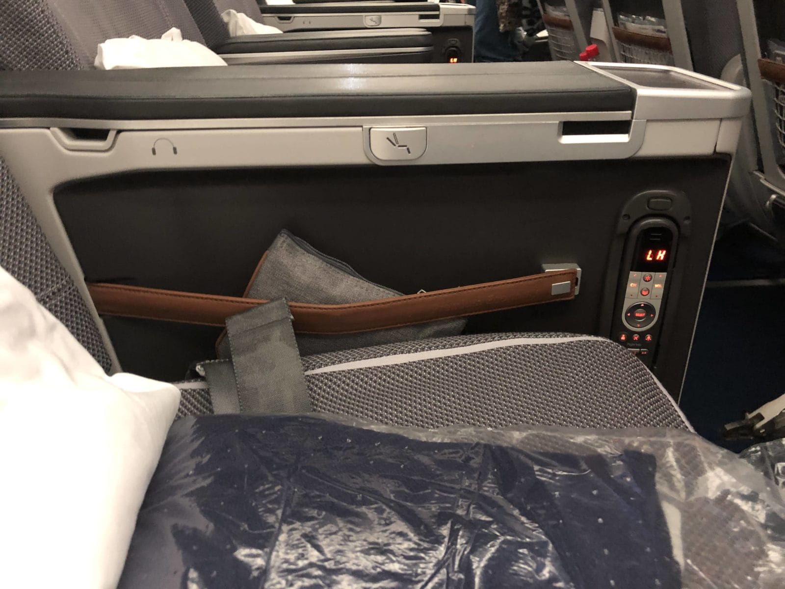 Die Kopfstütze lässt sich nach oben und unten verschieben und die “Ohren” seitlich verstellen. Der Tisch ist in der Mittelkonsole verstaut. Ausgefahren lässt dieser sich noch leicht nach vorne und hinten verschieben. In der Armlehne befinden sich auch die Anschlüsse für die Kopfhörer, die nach dem Start ausgeteilt und 30 Minuten vor der Landung wieder eingesammelt werden. Für mich ist das ein Nachteil gegenüber Airlines, die “Gate-to-Gate-Entertainment” anbieten.