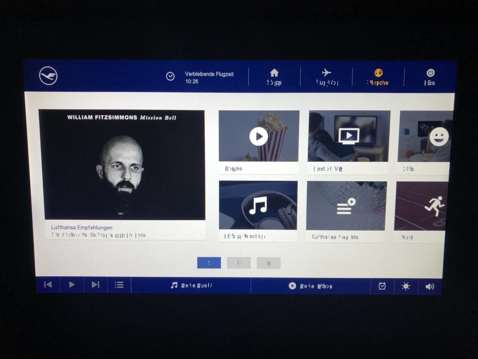Das Flightshow bei Lufthansa ist im Vergleich mit anderen Airlines eher dürftig. Man hat keinerlei Einstellmöglichkeiten, sodass die Beschriftung regelmäßig zwischen Chinesisch und Deutsch wechselte. Beide Flugzeuge besitzen ebenfalls Außenkameras. Der Monitor lässt sich übrigens leicht nach verstellen, um auf mögliche Lichtverhältnisse zu reagieren.
