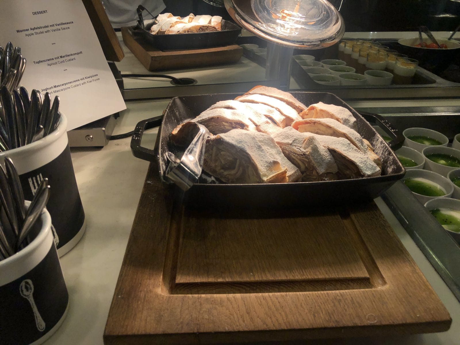 Wer schon einmal in einer der Lufthansa Lounges war, oder einen meiner Berichte gelesen hat, der kennt das Angebot an Essen in den Lufthansa Lounges. Auch in der Lufthansa Senator Lounge München G24 gab es nichts anderes. Auf den höheren Tischen zwischen Sitz- und Essensbereich standen Obst und Wasserkaraffen. Im hinteren Bereich der Lounge befand sich der Buffet Bereich mit Salatbar, einer Auswahl an Fleisch, Kartoffeln und Pasta, sowie Muffins, Kuchen und Bretzeln. Es gab zudem eine Smoothie Bar, die zum Zeitpunkt meines Besuches allerdings nicht besetzt war. Snacks, wie beispielsweise Nüsse und Chips, befinden sich versteckt hinten links in der Lounge. Positiv hervorzugheben in dieser eher kleinen Lounge ist die große Bar. Hier könnt ihr euch zum Beispiel einen Gin & Tonic mixen lassen. Eine Auswahl an den Getränken könnt ihr der Karte entnehmen. Für Koffein-Junkies steht eine Barista Kaffeemaschine bereit.