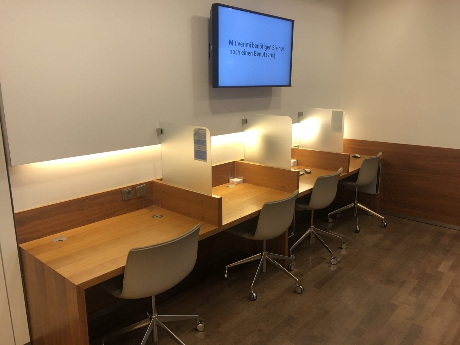 Im vorderen Bereich der Lounge gibt es einen großen Sitzbereich mit Sesseln und Barhockern. Unmittelbar dahinter schließt sich das Buffet und zugehörige Essensbereich an. Wollt ihr einen Drink oder frisch gemachten Kaffee zu euch nehmen bietet sich die Bar im hinteren Teil der Lounge an. Auf diese haltet ihr automatisch zu, wenn ihr die Lounge betretet. Links von der Bar befinden sich dann noch ein paar Arbeitsplätze. Ein separaten Raucheraum, wie es viele Lufthansa Lounges in Frankfurt haben, bietet die Lufthansa Senator Lounge München G24 seinen Gästen nicht.