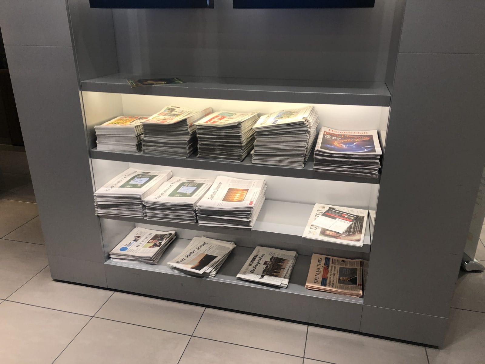 Im Vergleich zu anderen Senator Lounges ist die Lufthansa Senator Lounge München G24 eher klein und bietet nicht so viel Platz, wie zum Beispiel die Senator Lounges in Frankfurt oder auch die Senator Lounge im Satelliten Terminal in München. Direkt am Eingang der Lounge befindet sich ein Service Desk der Lufthansa und gegenüber sind Schließfächer – groß genug um einen Trolley dort zu verstauen. Direkt daneben befinden sich zwei Telefonkabinen und ein kleiner Worldshop-Bereich. Es folgen die Sanitäranlagen und Duschen. Bevor ihr den Hauptbereich der Lounge betritt, könnt ihr euch noch eine Tageszeitung schnappen.