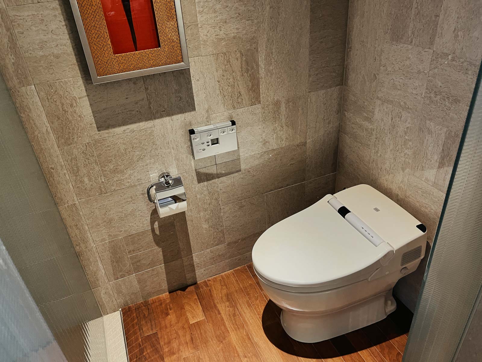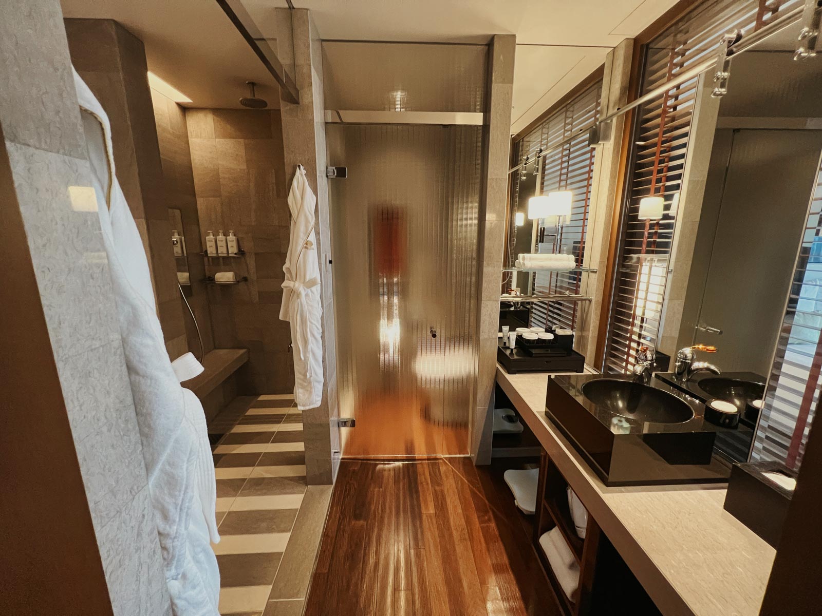 Das Badezimmer war ziemlich groß, wobei direkt beim Betreten rechts die Konsole mit Waschbecken war, geradeaus das (natürlich japanische) WC und links die Badewanne sowie begehbare Dusche. In Letzterer gab es große Behälter für Shampoo & Co, was zwar nicht so recht in ein Luxushotel passt, das Preise jenseits der 1.000 Euro aufruft, aber in Japan wohl üblich zu sein scheint und im Hinblick auf Nachhaltigkeit wohl auch Sinn macht.