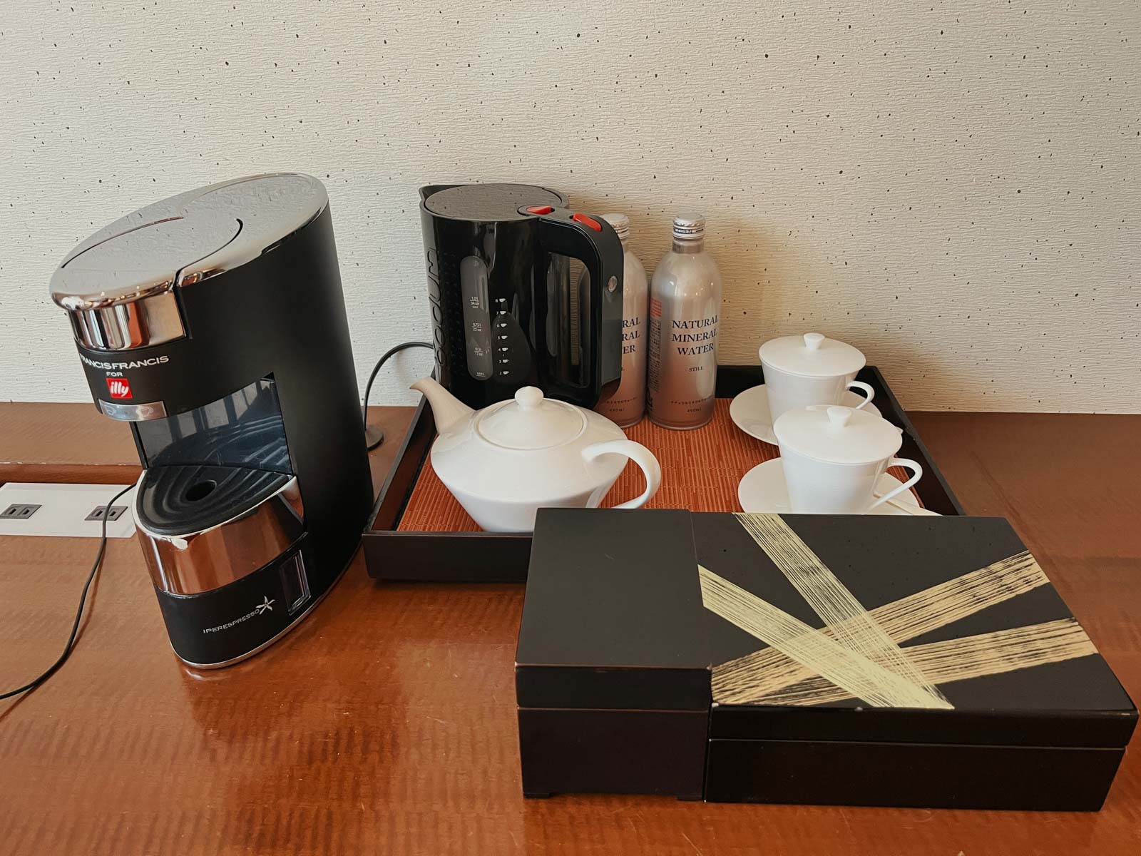 Auch eine Kaffeemaschine mit Kaffee (von illy) sowie ein Wasserkocher dürfen nicht fehlen. Beides habe ich nicht genutzt, stattdessen habe ich das Wasser getrunken, das ebenfalls kostenlos war.